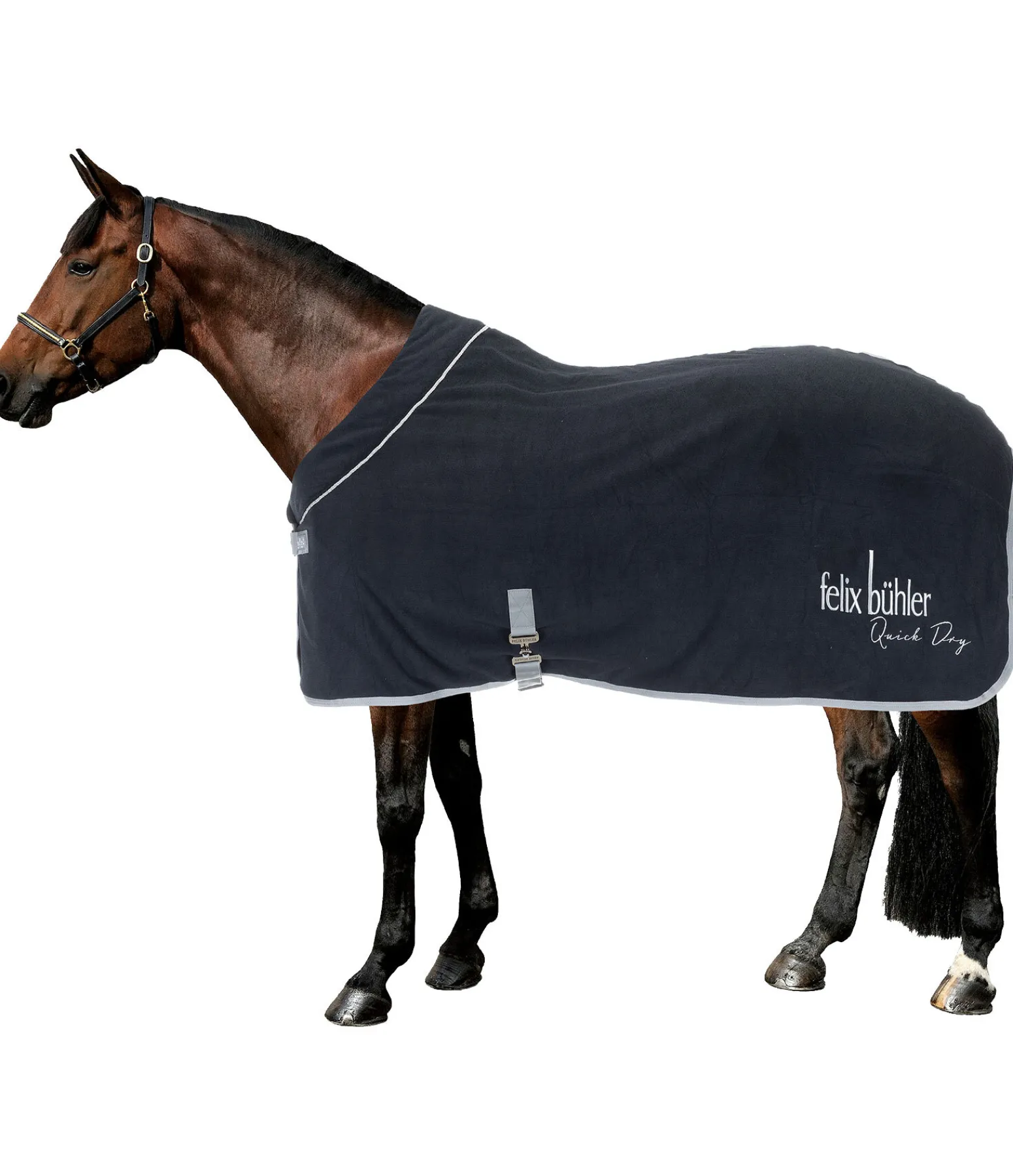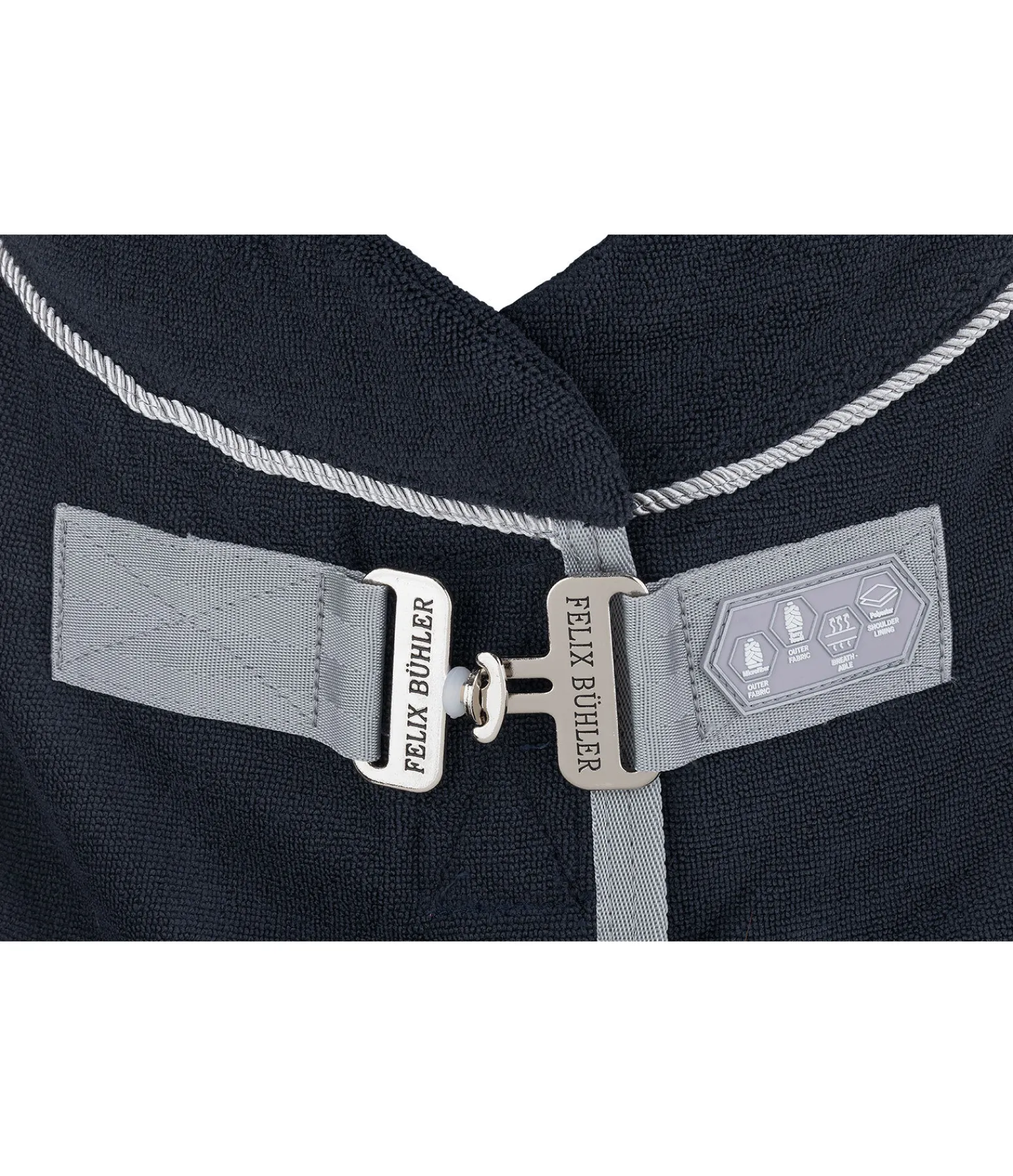 Chemise séchante idéale pour la mi-saison, lorsqu’il fait déjà un peu trop chaud ou pas encore assez froid pour les couvertures en polaire traditionnelles. Cette chemise légère en tissu éponge en microfibre est un peu plus fine que les couvertures en polaire, mais aussi moins chaude, ce qui permet au cheval de moins transpirer. En même temps, la matière absorbe extrêmement bien l’humidité, ce qui permet au cheval de sécher rapidement et efficacement. Le cordon décoratif à l’encolure et la broderie sophistiquée lui confèrent un look attrayant. Avec une doublure lisse et douce pour la robe au poitrail et aux épaules afin d’éviter la casse des poils et les frottements. Fermeture simple au poitrail avec crochet en T. Rabat ventral amovible et réglable des deux côtés permettant à la chemise d’être également utilisée comme simple plaid. Courroie de queue réglable. 100 % polyester.