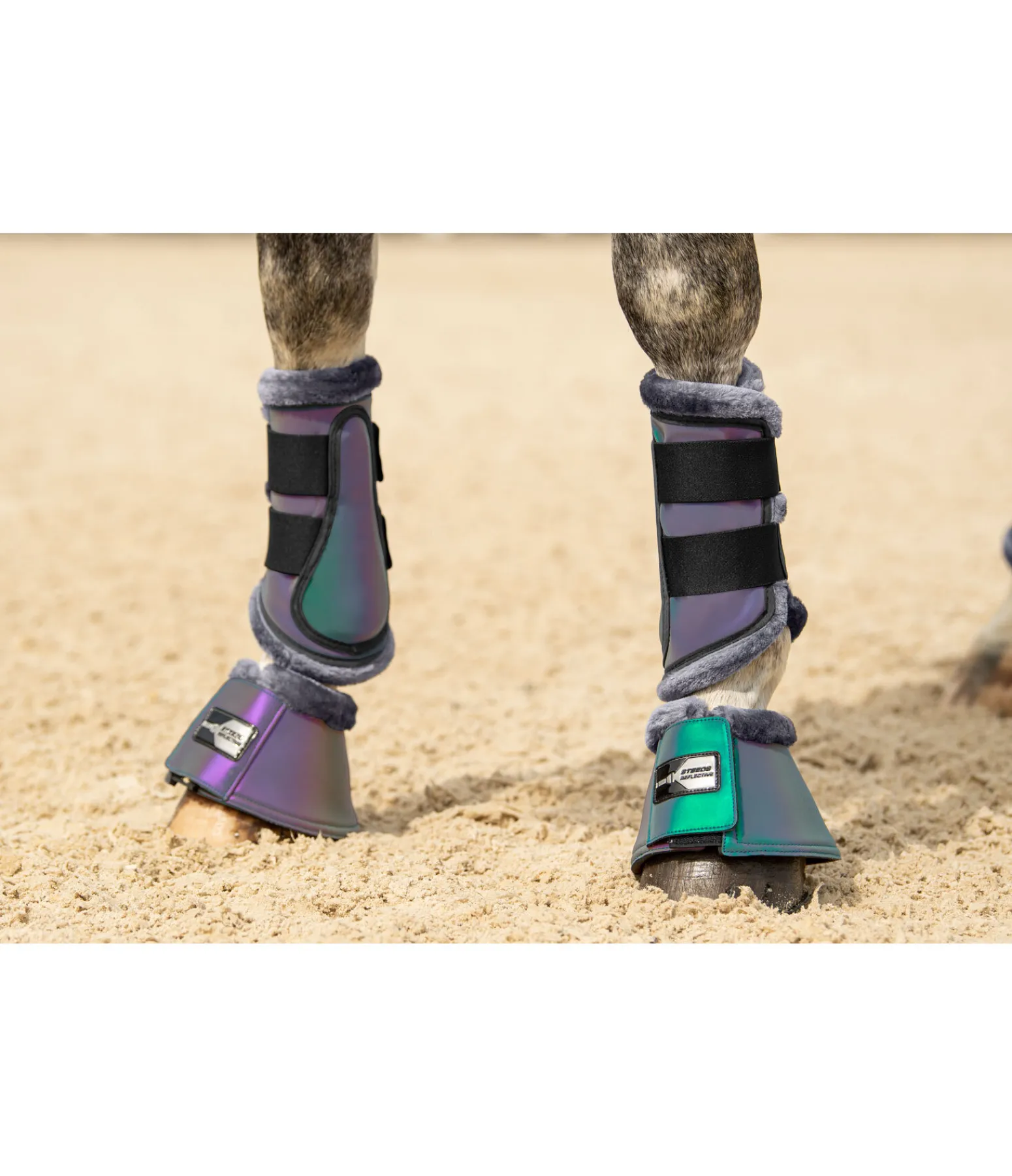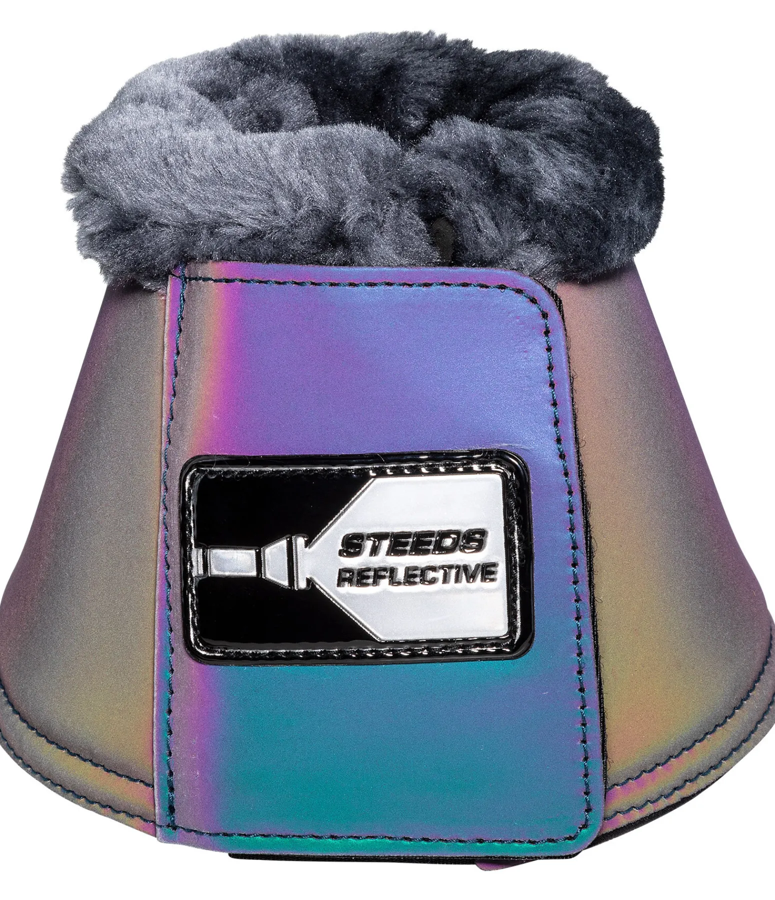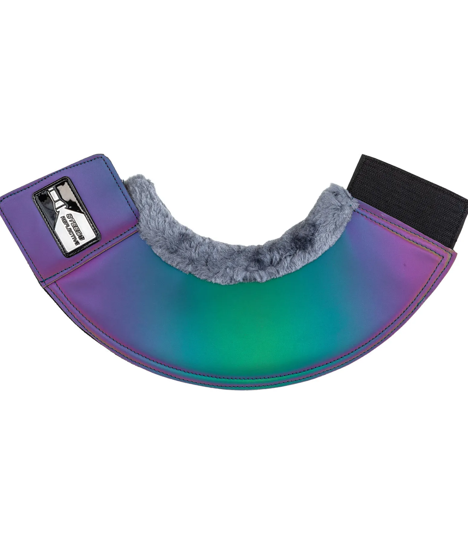 Incontournable pour les promenades à cheval au crépuscule ou à la tombée de la nuit. Cloches robustes et réfléchissantes aux couleurs de l’arc-en-ciel. Bordure en polaire Teddy douce pour protéger la couronne. Large patte auto-agrippante, décoré d’un logo réfléchissant, pour une fermeture rapide et un maintien fiable. Extérieur en polyester, imperméable et robuste. Intérieur rembourré en caoutchouc chloroprène. Compatible avec les guêtres réfléchissantes STEEDS Holographic (art. 600 000 et 600 001).