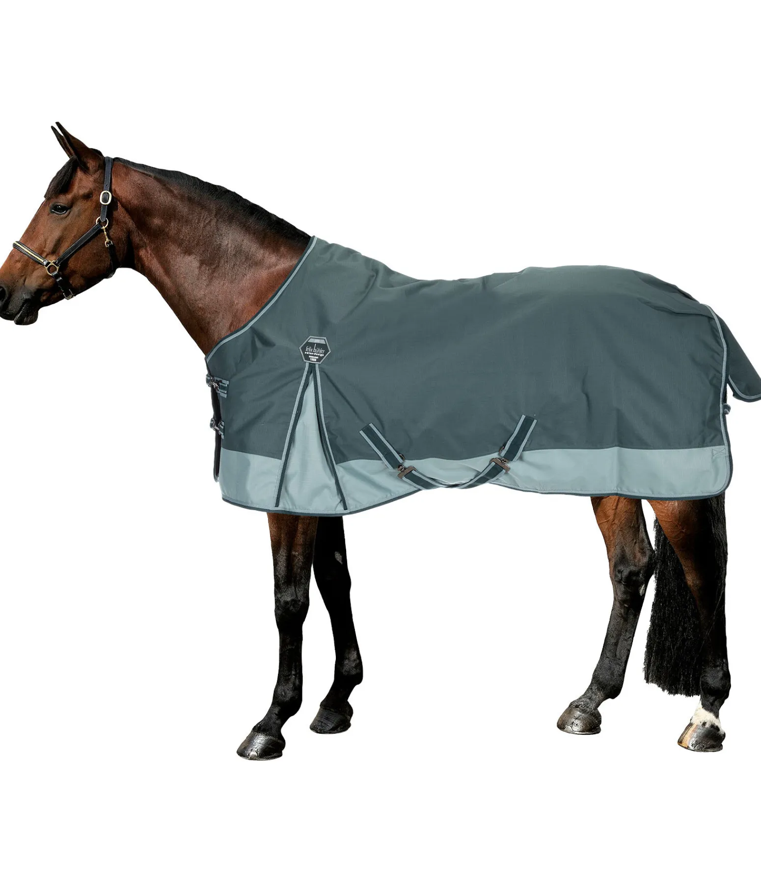 Couverture d’extérieur bicolore résistante et imperméable (3 000 mm) en matière Ripstop solide (1 200 deniers). Coussins au niveau du garrot pour le protéger et éviter les pressions. Garnissage 150 g apportant de la chaleur. Doublure lisse protégeant la robe. Double fermeture de poitrail réglable avec mousquetons et patte auto-agrippante supplémentaire pour un maintien sûr. Grands plis d’aisance pour une liberté de mouvement optimale. Sursangles croisées, anneaux permettant de fixer des courroies de cuisses (non incluses) et courroie de queue réglable. 100 % polyester.