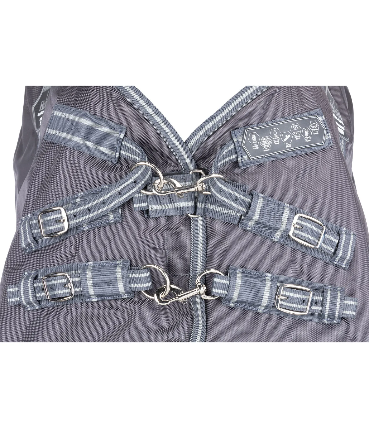 Couverture d’extérieur fonctionnelle et polyvalente dans une coupe classique (Regularneck). Matériau 1 680 deniers particulièrement résistante. Grande imperméabilité (colonne d’eau 5.000 mm). Comparé au polyester, le nylon est nettement plus doux et présente des reflets satinés. Matière beaucoup plus extensible que le polyester pour une meilleure résistance à la déchirure. Garnissage chaud de 300 g. Inserts extensibles et déperlants en softshell au niveau des épaules et de l’encolure. Grands plis d’aisance pour une liberté de mouvement optimale afin d’éviter les pressions. Rembourrage intérieur généreux pour minimiser davantage les pressions au niveau du garrot. Fermeture de poitrail réglable équilibrée en 3 points, constituée de 2 anneaux et mousquetons et d’une patte auto-agrippante supplémentaire. Les mousquetons peuvent être facilement remplacés si besoin. Doublure lisse protégeant la robe. Sursangles croisées réglables et anneaux permettant la fixation de courroies de cuisses (non incluses). Courroie de queue et rabat de queue réglables en longueur avec bandes et passepoil réfléchissants sur le pourtour. Inclus des fixations supplémentaires pour un couvre-cou optionnel (article 422 669).