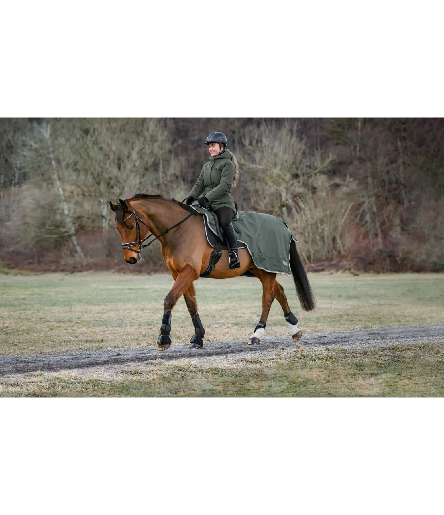 Couvre-reins imperméable (3.000 mm) et coupe-vent, en matière Ripstop 600 deniers, avec garnissage léger 50 g dans la zone des reins. Protège efficacement les reins et les flancs. Avec découpe pour selle anglaise. Large patte auto-agrippante au niveau du garrot pour une mise en place facile. Rabat de queue et courroie de queue réglable inclus. 100 % polyester.