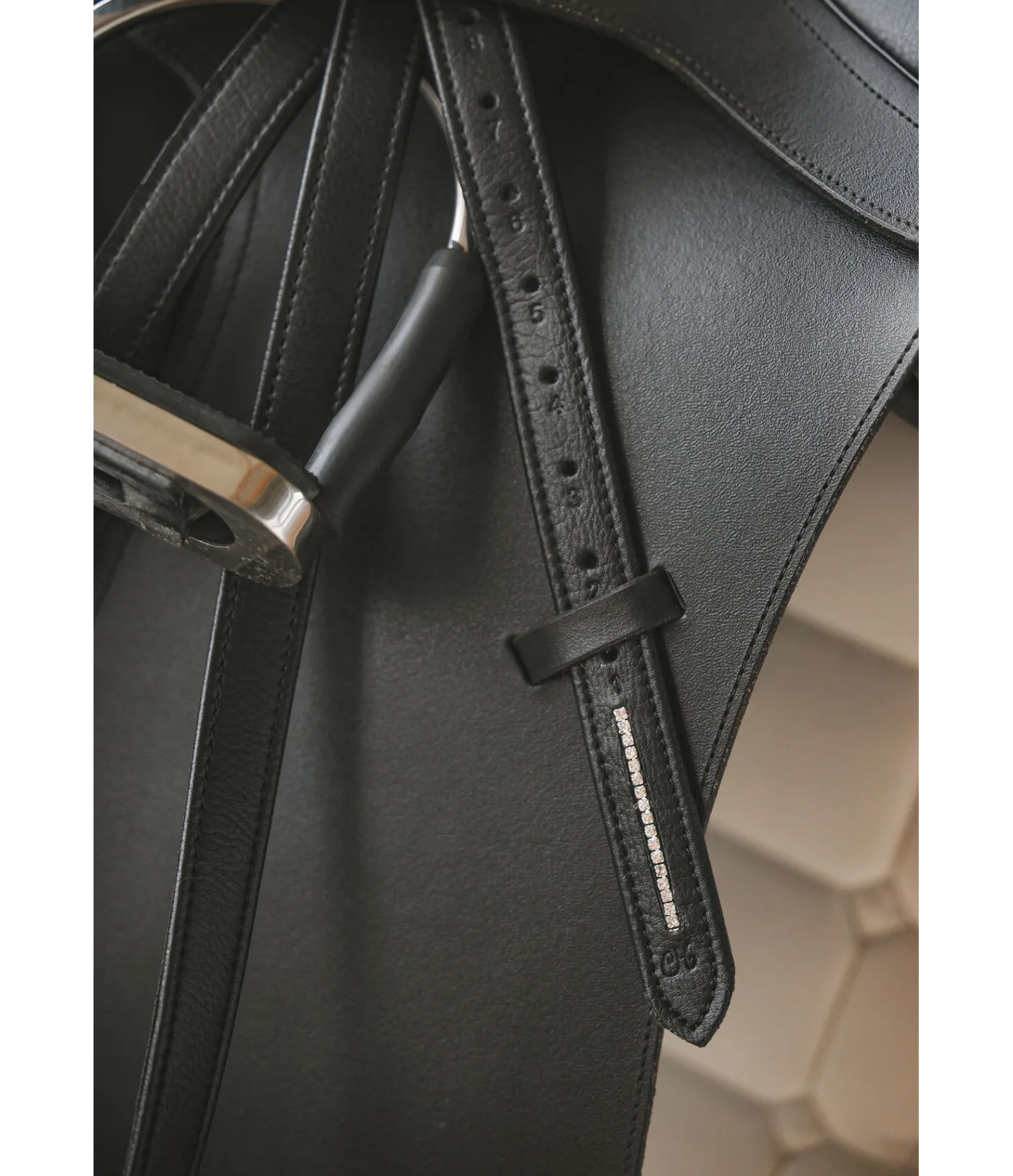 Étrivières en synthétique SYLKA particulièrement résistant, solide, facile d’entretien et souple. Ornées d’une rangée de petits strass blancs. Bouclerie en acier argenté lègerement courbée. Largeur 2,5 cm. Vendues par paire.