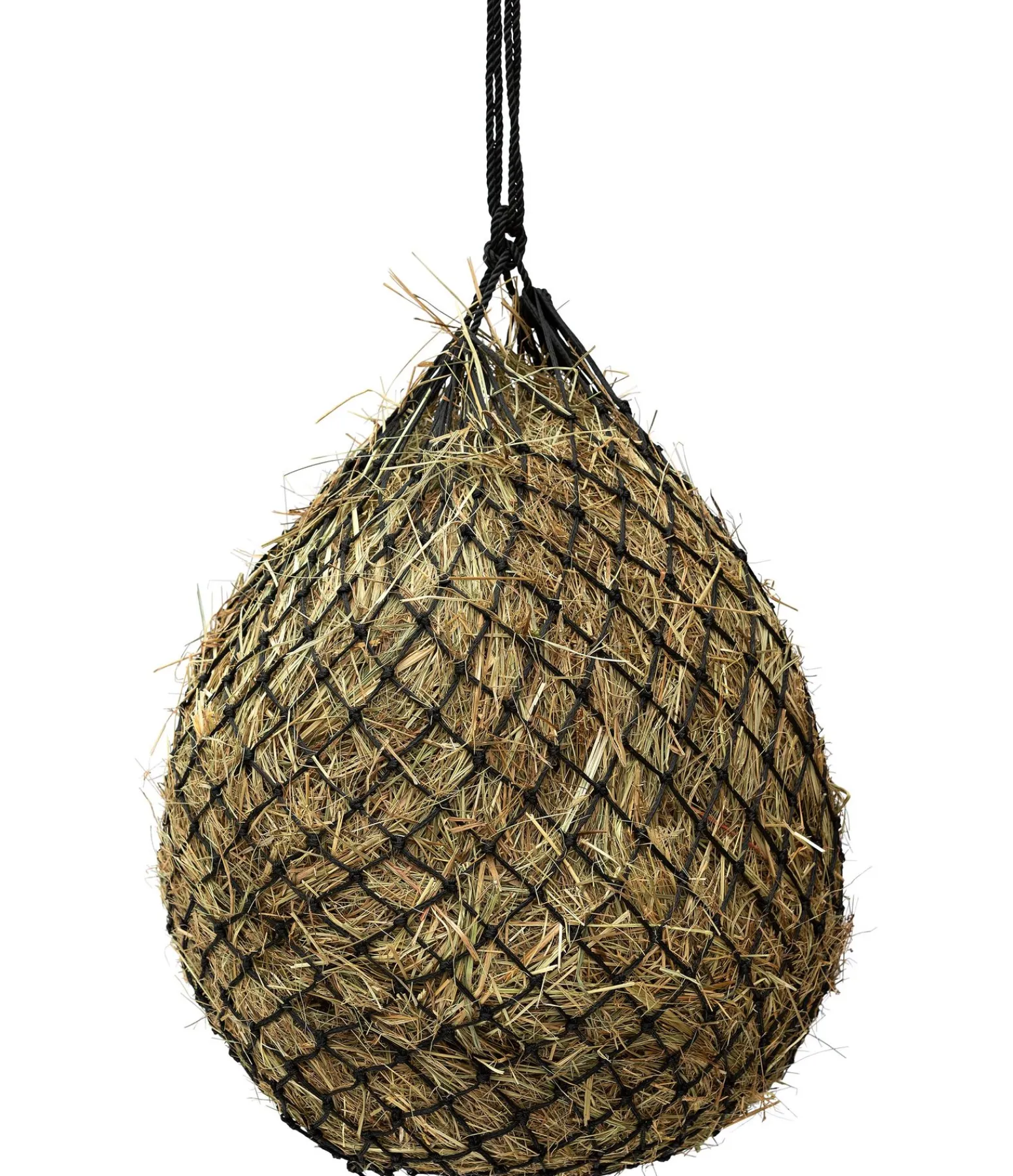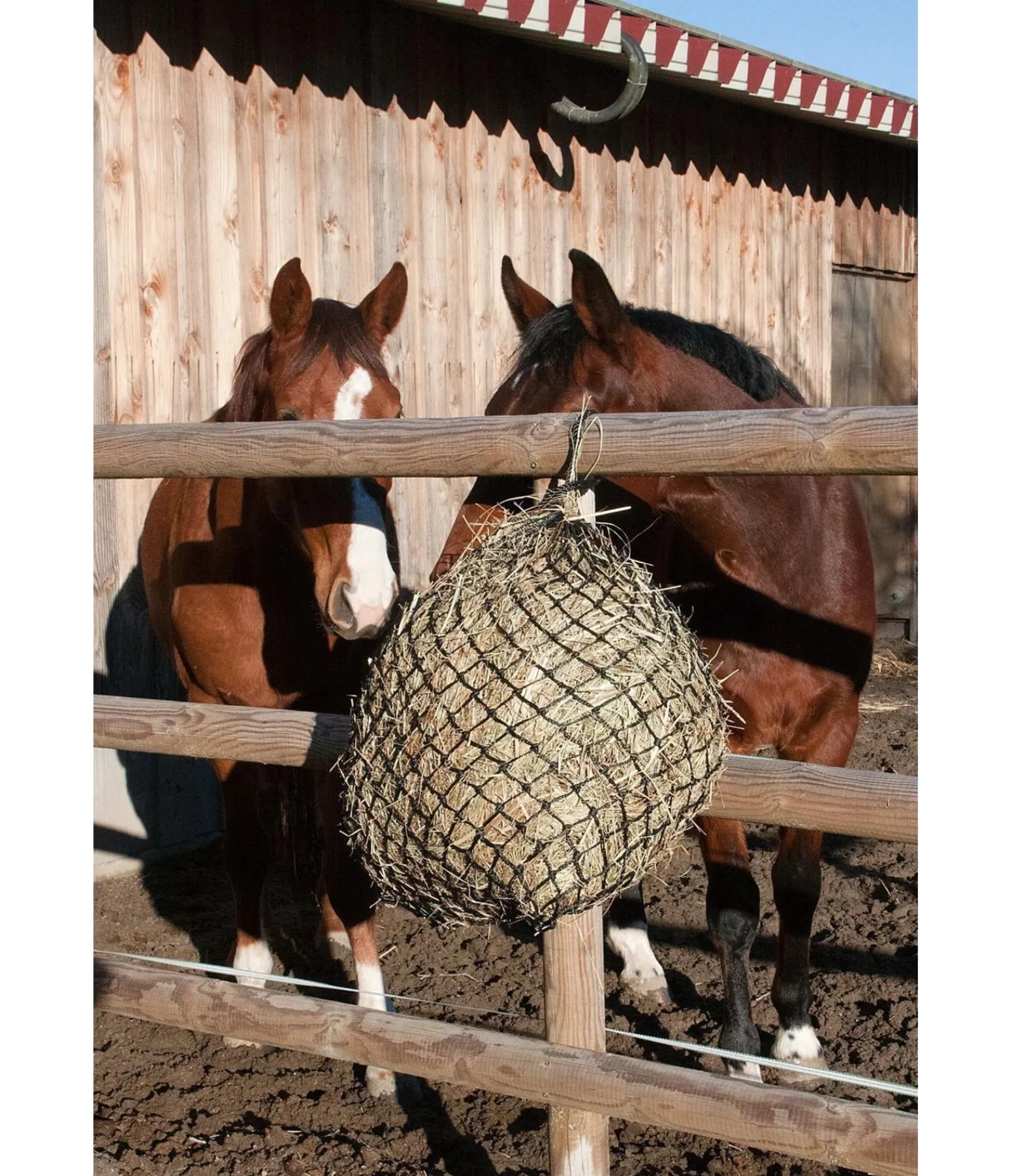 Filet à foin en polypropylène. Dimensions des mailles : 3 x 3 cm. Dimensions du filet vide : 90 x 90 cm. Capacité 4 kg.
