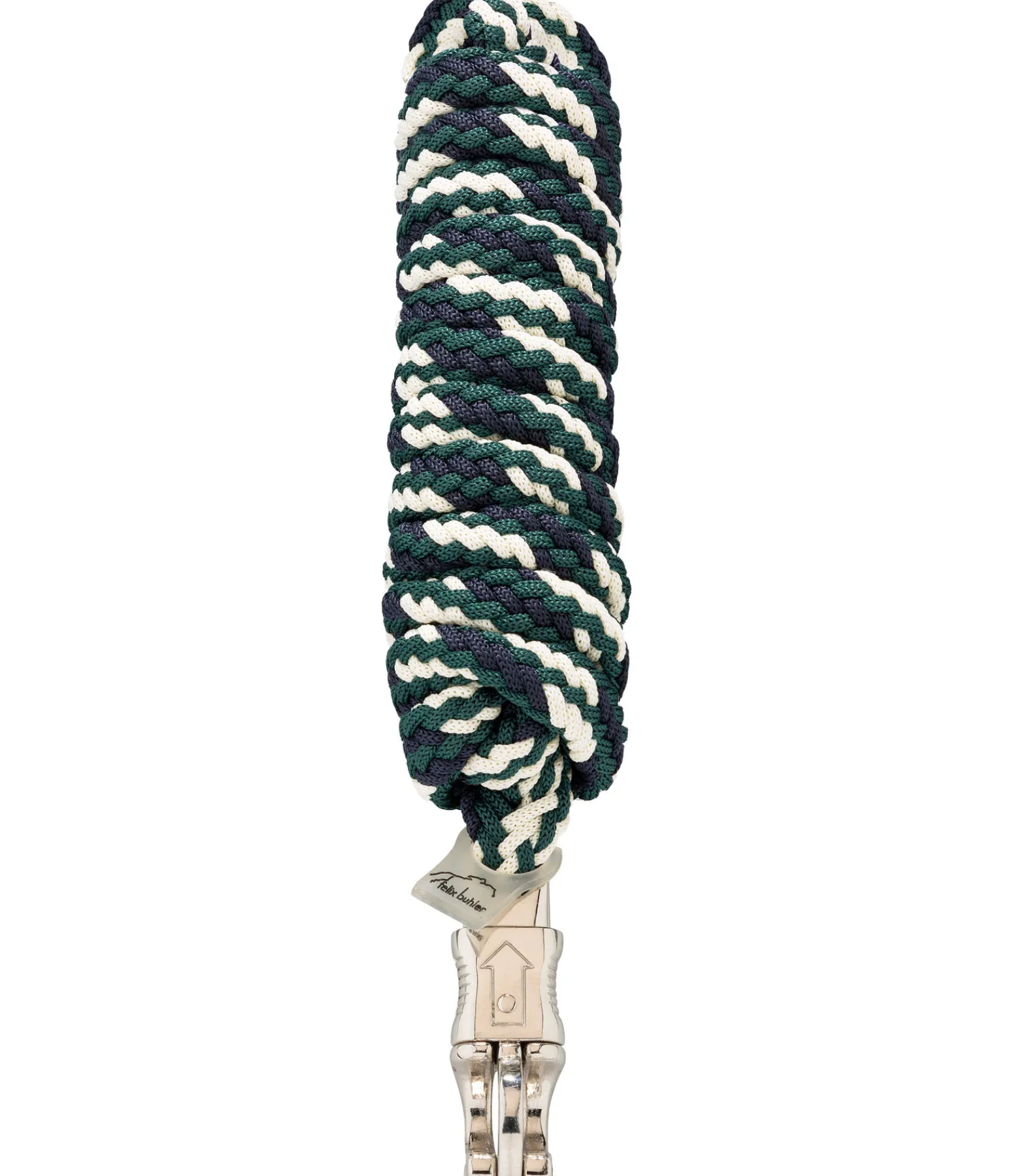 Longe tressée tricolore. Assortie au licol 440 830. Avec mousqueton anti-panique de couleur assortie. 2,2 m. 100 % polyester.