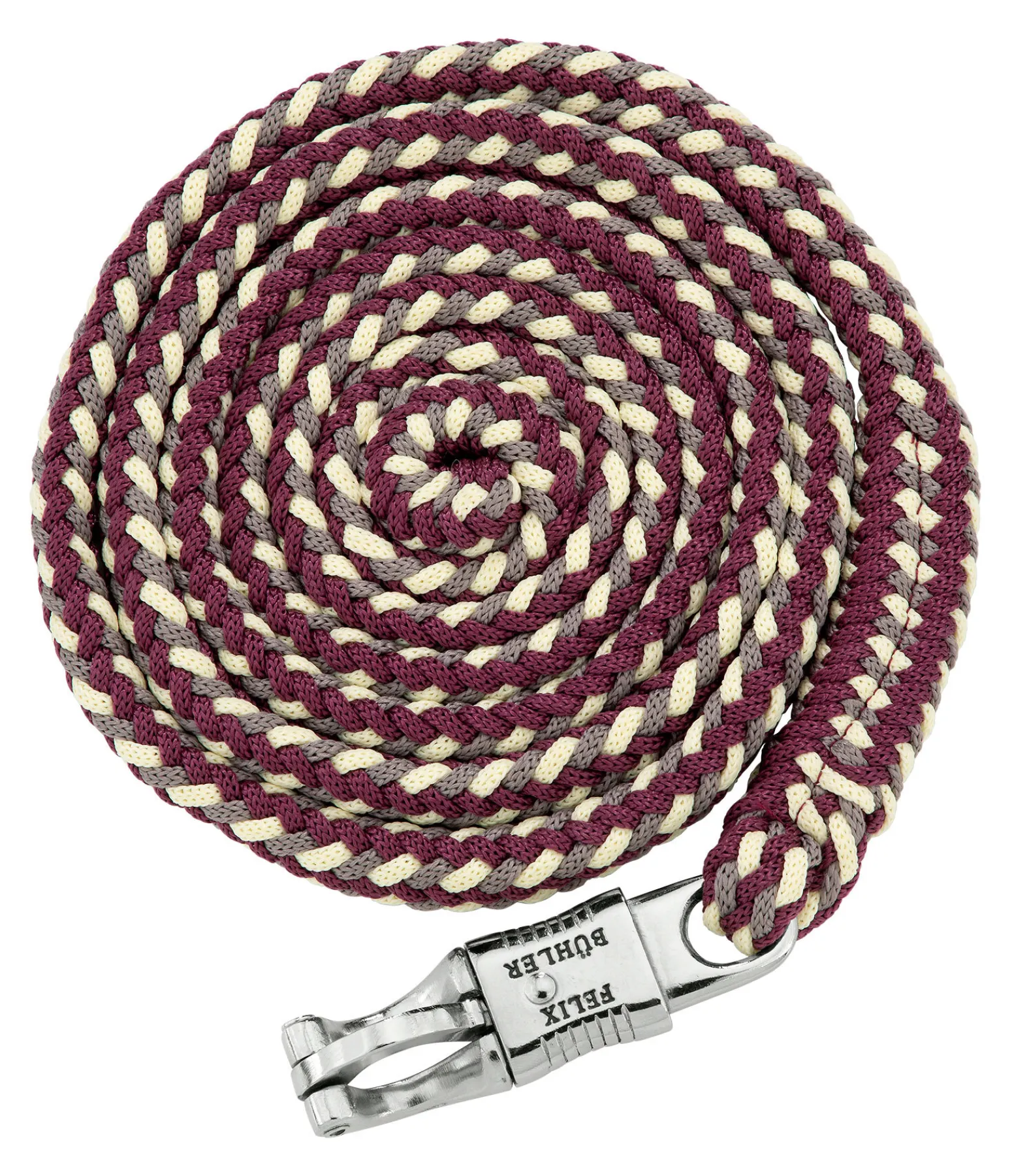 Longe tressée tricolore solide avec mousqueton anti-panique. 2 m. 100 % polyester. Assortie au licol 310056.