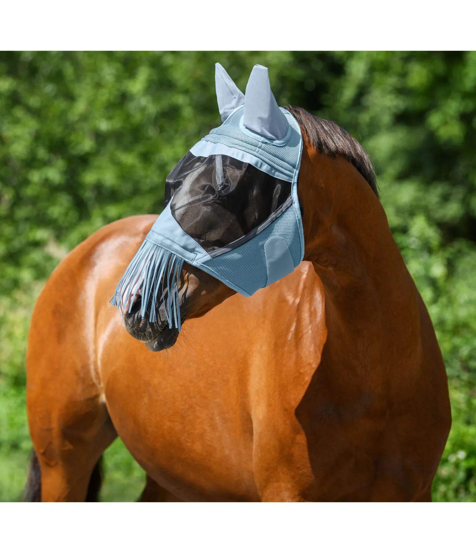 Masque anti-mouches à franges en mesh MVT (Moisture Vapor Transmission) respirant, qui permet une circulation de l’air constante sous le masque et évite ainsi la surchauffe. Protège parfaitement les oreilles, les naseaux et les yeux contre les moustiques et autres insectes. Les franges au niveau des naseaux empêchent les insectes de se poser sur la tête du cheval. Mailles serrées et coutures permettant de maintenir le filet à distance des yeux. Doublure en tissu éponge absorbant au niveau du front pour un confort optimal et bordure en polaire autour du chanfrein pour éviter les irritations dues aux frottements. Matière stretch extensible perforée aux oreilles. Large patte auto-agrippante pour une mise en place et un retrait facile et rapide. 100 % polyester.