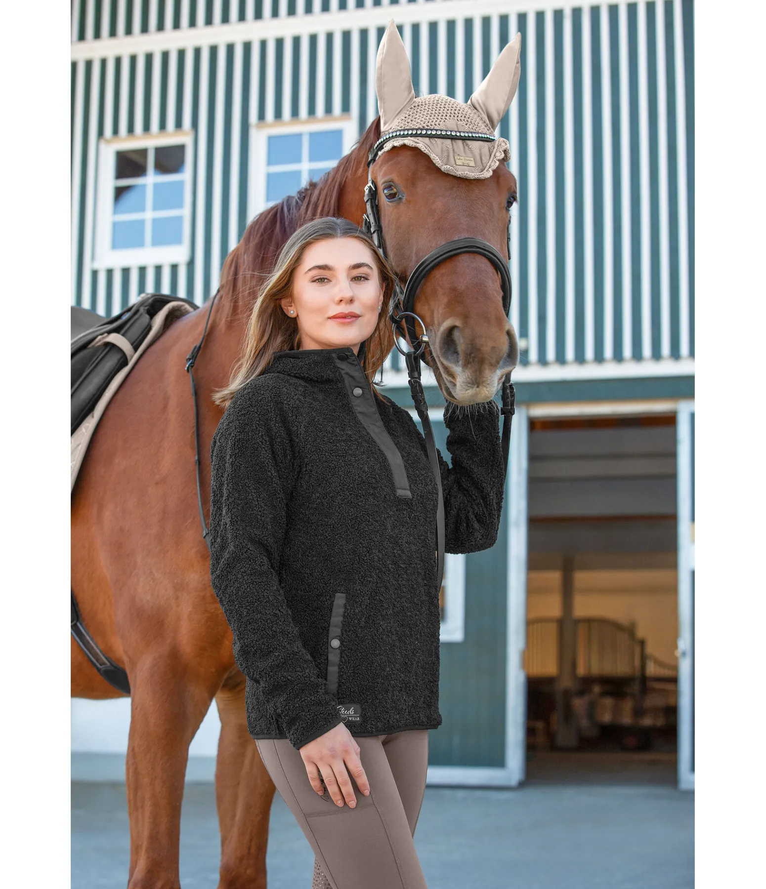 Sweat à capuche en tricot polaire Teddy douce. Patte de boutonnage avec boutons-pression de couleur contrastante. Deux poches latérales avec bouton-pression. Bord élastiqué de couleur contrastante sur le bas des manches, la capuche et l’ourlet. Étiquette STEEDS à l’ourlet. 100 % polyester.
