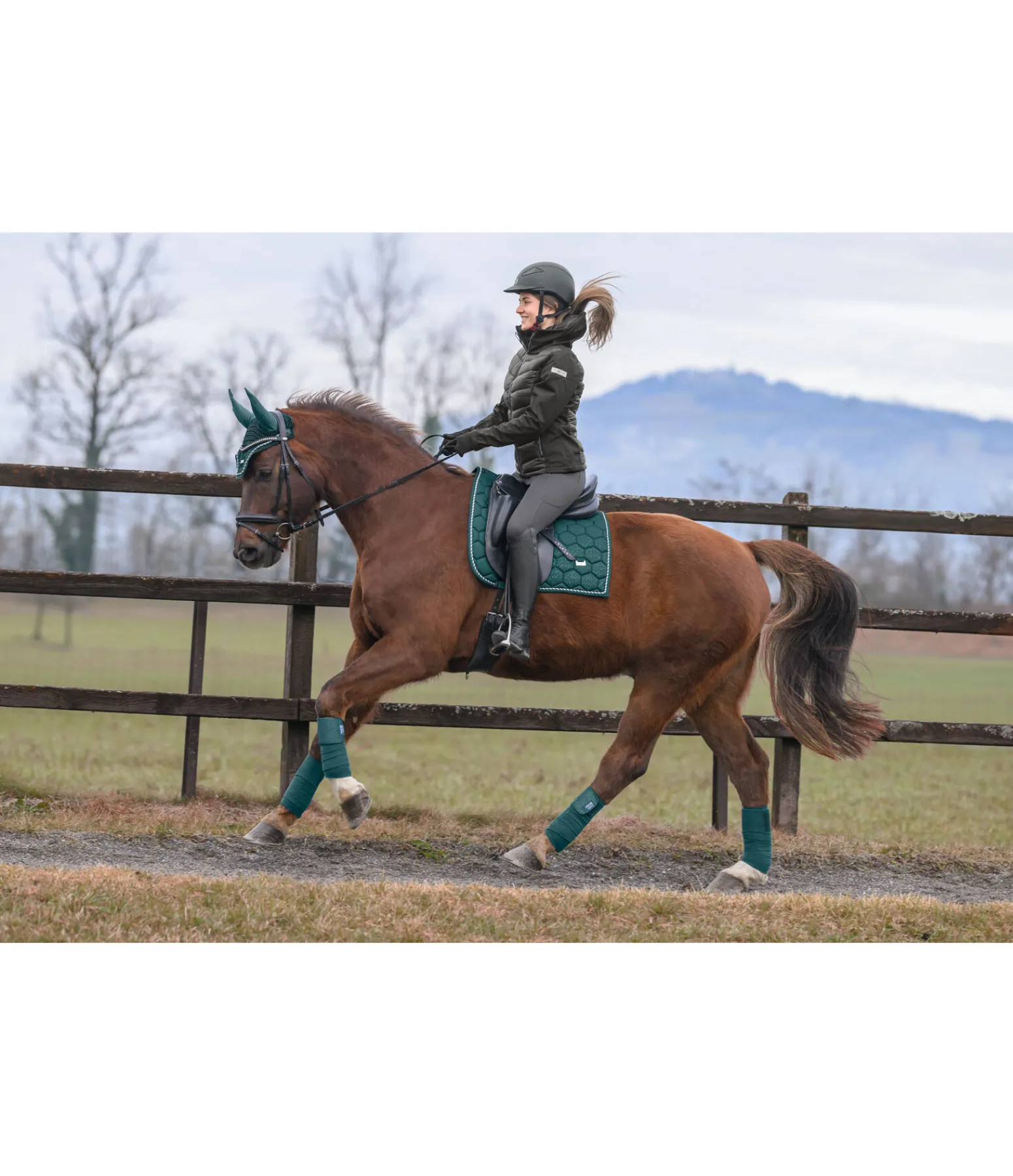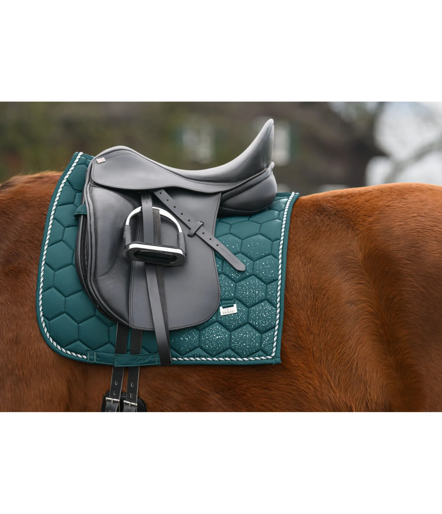 Tapis de selle de forme carrée. Satiné et orné de fragments scintillants, d’un triple cordon décoratif et d’une petite plaque métallique avec logo gravé. Plaque argentée en S, dorée en CO et rose-doré en NV. Passants de sangle et de contre-sanglons avec patte auto-agrippante pratique. Dessous en Air mesh respirant et absorbant l’humidité. 100 % polyester.