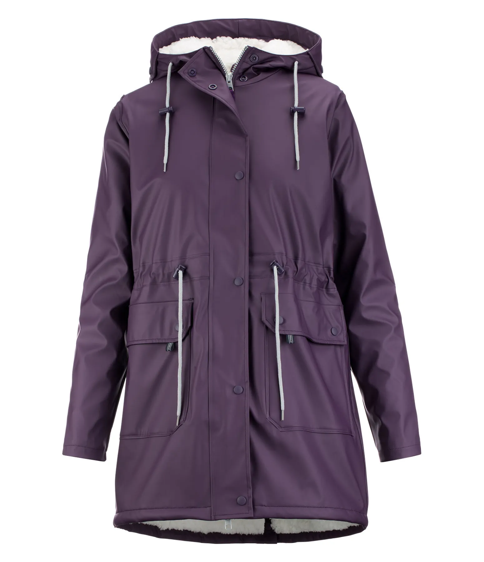 Veste d’équitation de pluie douce et chaude avec doublure intégrale en polaire Teddy. Large capuche réglable en cas de forte pluie. Imperméable et coupe-vent. Fermeture à glissière double sens dissimulée. 2 poches latérales à rabat avec boutons-pression. Taille ajustable par cordon de serrage. 1 fente cavalière avec boutons-pression à l’arrière. Imprimé STEEDS sur la manche et la capuche. 100 % polyuréthane, doublure en polaire Teddy 100 % polyester.