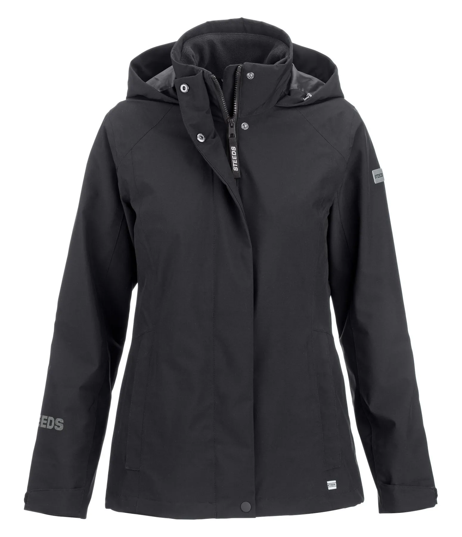 La veste 3 en 1 de STEEDS combine deux vestes en une et offre au total 3 styles différents : tu peux porter chaque couche séparément ou ensemble ! La veste extérieure coupe-vent, imperméable (10 000 mm) et respirante possède un col haut avec capuche pouvant être enroulée dans le col ou fixée dans le dos par bouton pression, une fermeture à glissière double sens dissimulée, 2 poches zippées dissimulées, des bas de manche et une taille réglables, un imprimé STEEDS réfléchissant, un badge logo STEEDS sur la manche et une poche intérieure zippée. La doublure en polaire se fixe avec une fermeture à glissière et peut donc être portée avec ou sans la veste extérieure. Cette doublure a un col montant, 2 poches avec bouton-pression et une broderie STEEDS sur la manche. Les deux vestes ont une coupe plus longue à l’arrière. 100 % polyester, membrane intérieure 100 % polyuréthane.