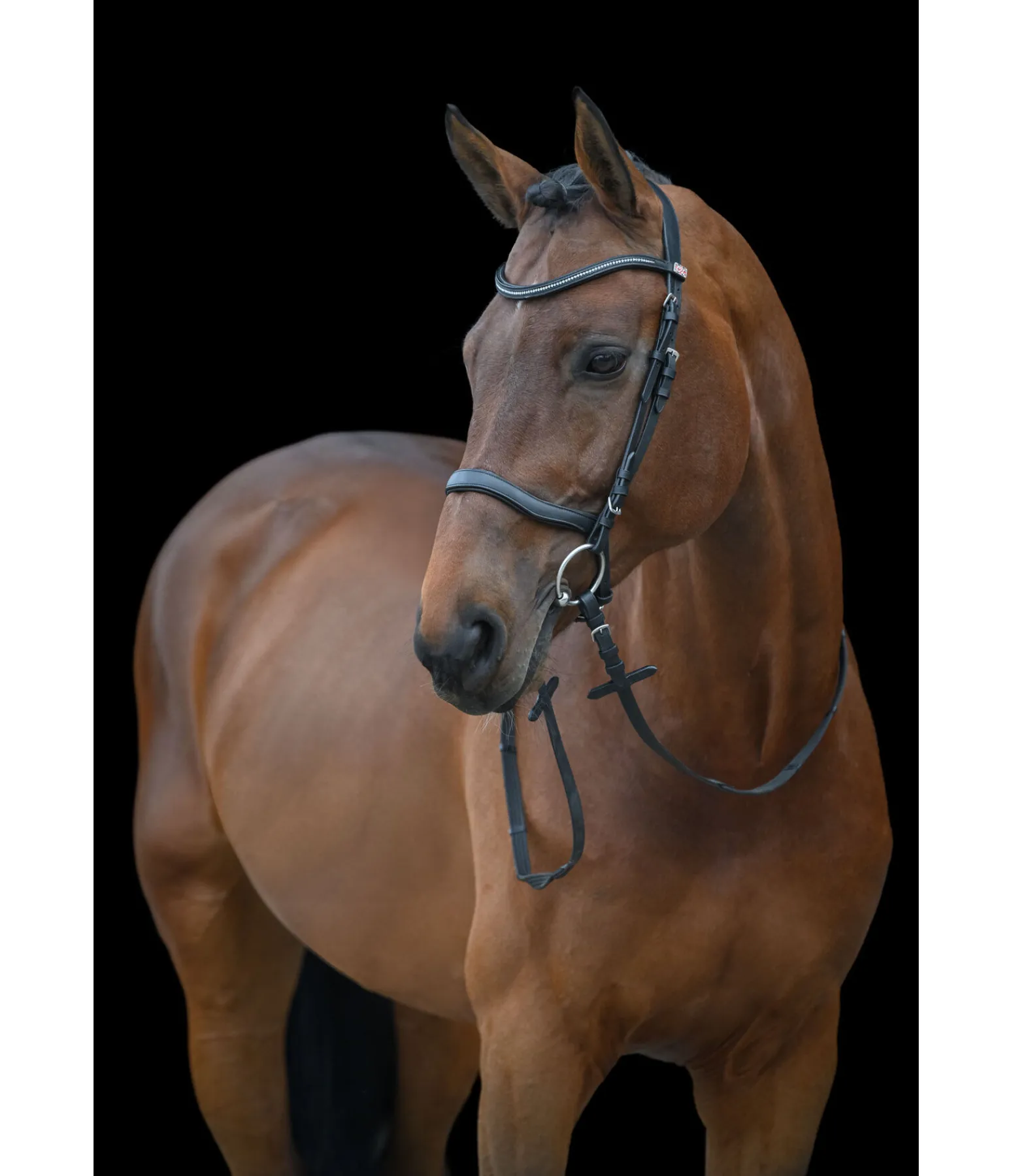 Bridon épuré avec têtière et muserolle anatomiques. Muserolle ergonomique permettant d’éviter les pressions sur les nerfs faciaux sensibles, au niveau des zygomatiques ainsi que sur la mâchoire et les dents. Doublure douce en cuir véritable. Sans noseband ni sous-gorge pour favoriser la mastication. Frontal vague classique avec strass. Bouclerie argentée. Rênes et mors non inclus.