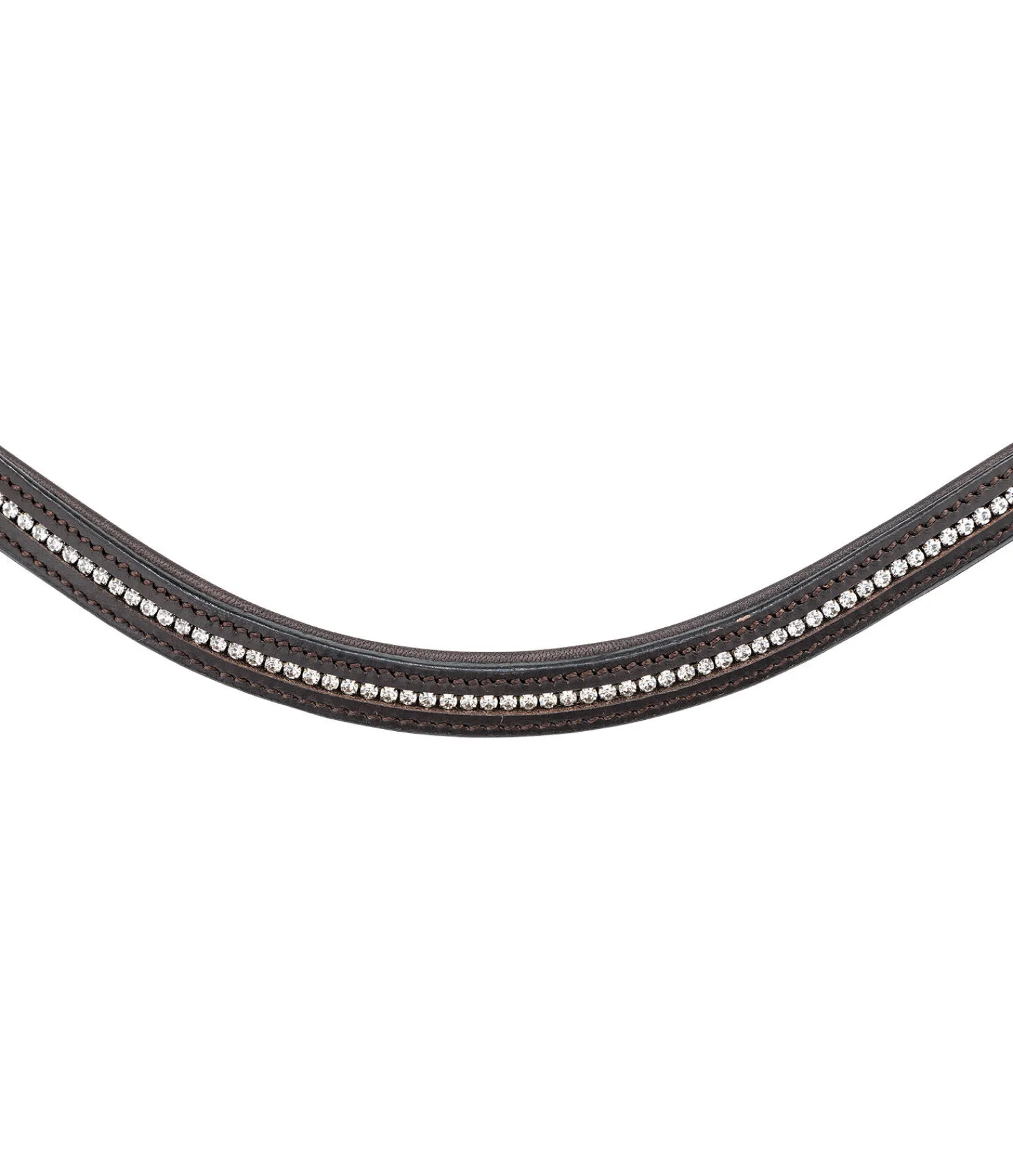Bridon épuré avec têtière et muserolle anatomiques. Muserolle ergonomique permettant d’éviter les pressions sur les nerfs faciaux sensibles, au niveau des zygomatiques ainsi que sur la mâchoire et les dents. Doublure douce en cuir véritable. Sans noseband ni sous-gorge pour favoriser la mastication. Frontal vague classique avec strass. Bouclerie argentée. Rênes et mors non inclus.