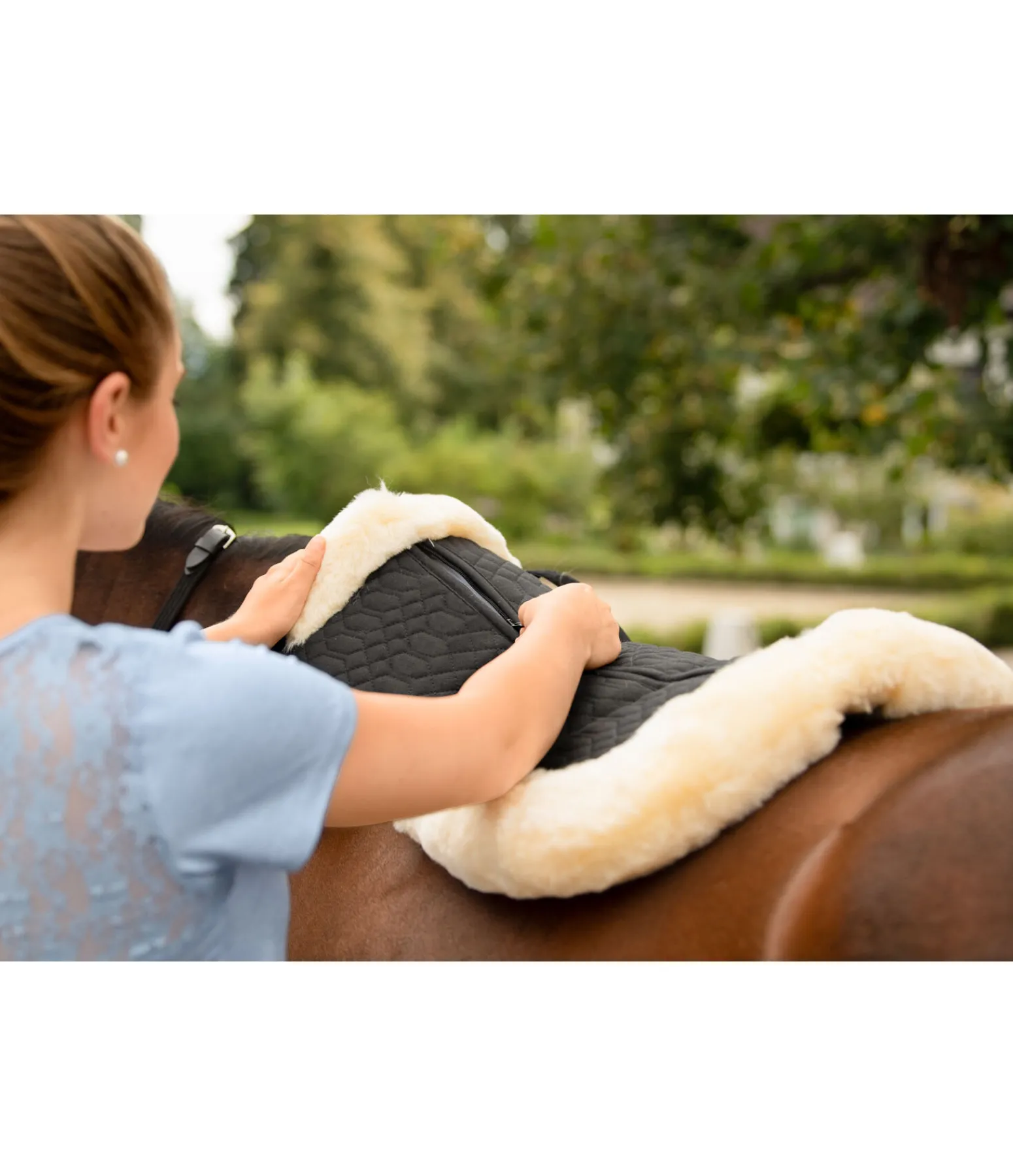 Amortisseur pour équilibrer la selle grâce à plusieurs pads. 6 poches avec fermeture à glissière. Chaque poche contient 3 pads en feutre pouvant être utilisés indépendamment. Bordé et entièrement doublé de fourrure d’agneau à tannage médical. Le long de la colonne vertébrale, la fourrure d’agneau est plus courte pour permettre un mouvement optimal des vertèbres. Passant de contre-sanglons avec patte auto-agrippante. Longueur de dos 65 cm. Fourrure 100 % agneau mérinos, tissu matelassé : 70 % polyester, 30 % coton, rembourrage 100 % polyester. Lavable à 30 degrés programme d’entretien de la laine. Laver uniquement avec une lessive spéciale fourrure d’agneau. Ne pas mettre au sèche-linge.