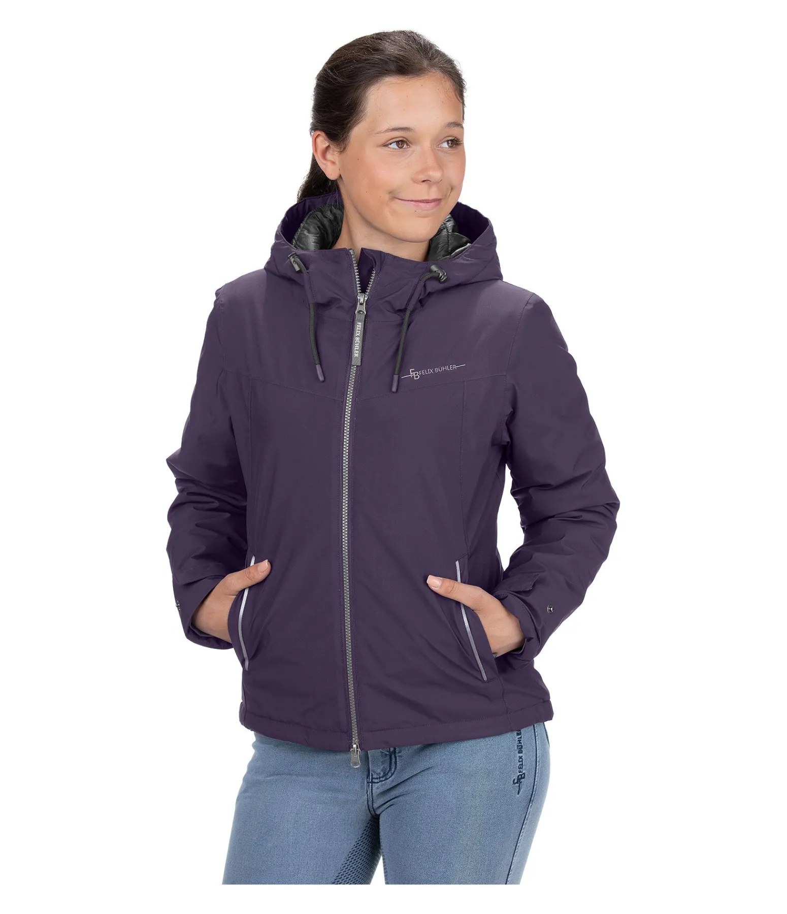Blouson d’équitation court très technique avec capuche. Garnissage chaud en imitation duvet. Très imperméable (10.000 mm), coupe-vent et respirant. 2 poches zippées, fermeture à glissière double sens avec sous-patte, taille réglable, capuche ajustable par cordon de serrage, bas des manches réglable. Imprimé Felix Bühler réfléchissant sur la poitrine. 100 % polyester, doublure 100 % nylon.