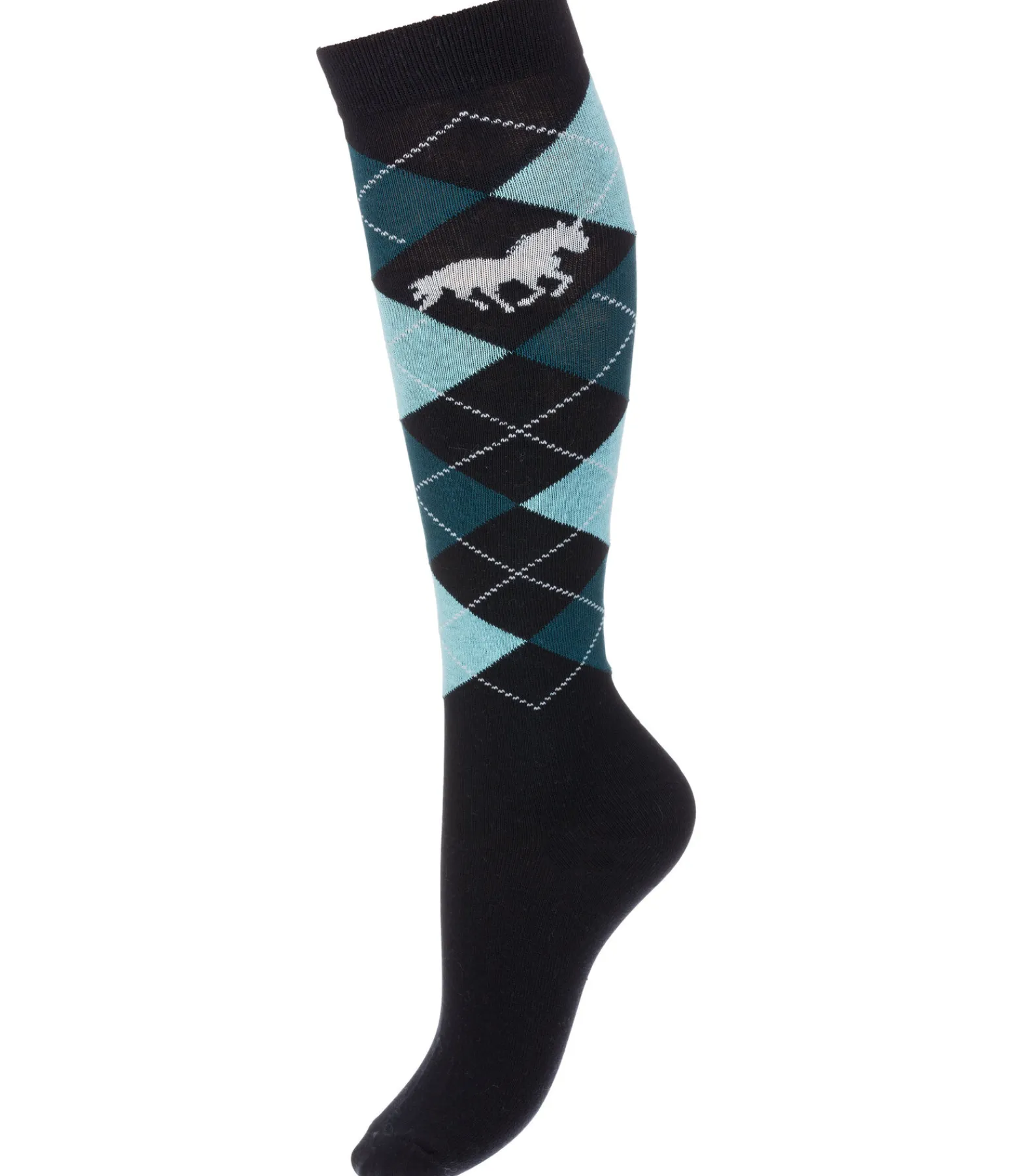 Chaussettes hautes pour enfant en design losanges classique avec motif cheval. Matières : 80 % coton, 20 % élasthanne.