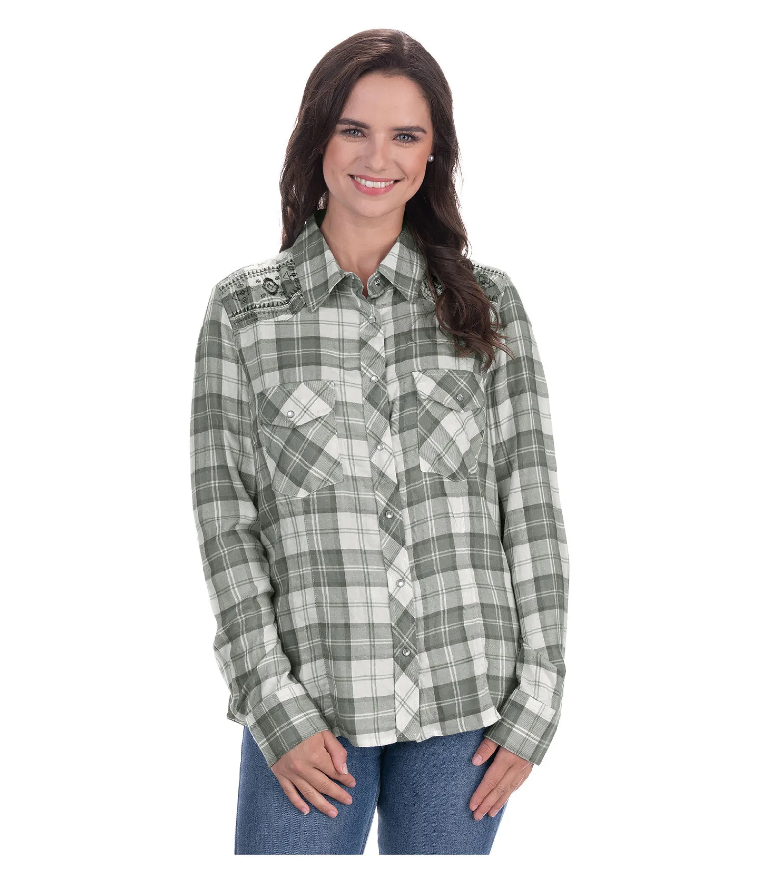 Chemise à carreaux. Coupe droite. Deux poches plaquées sur la poitrine. Patte de boutonnage et bas des manches avec boutons-pression nacrés. Yoke western brodé avec motif aztèque. Matière respirante. 100 % viscose.