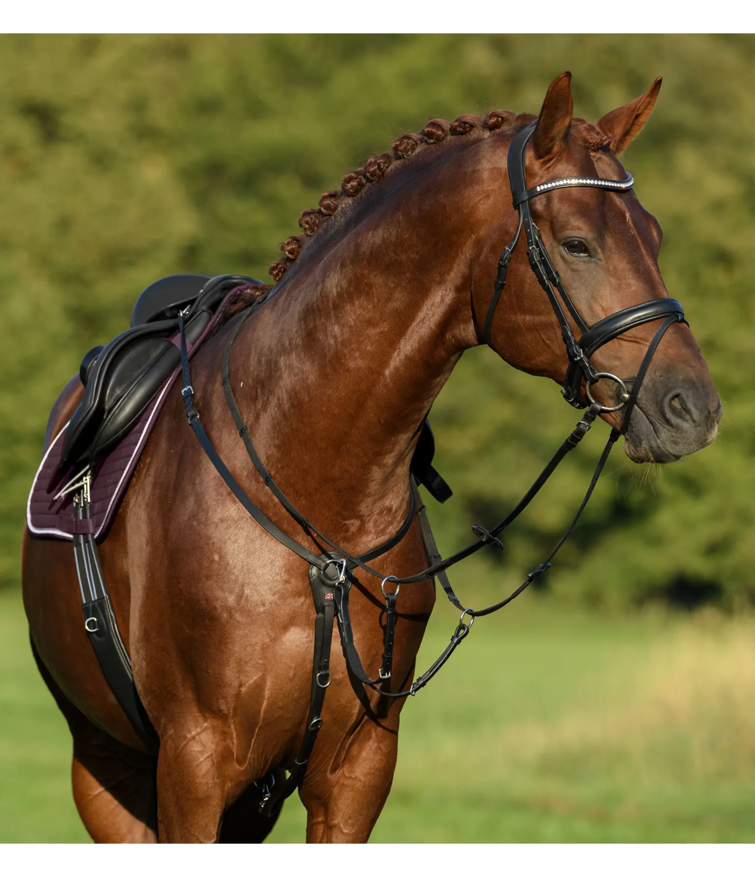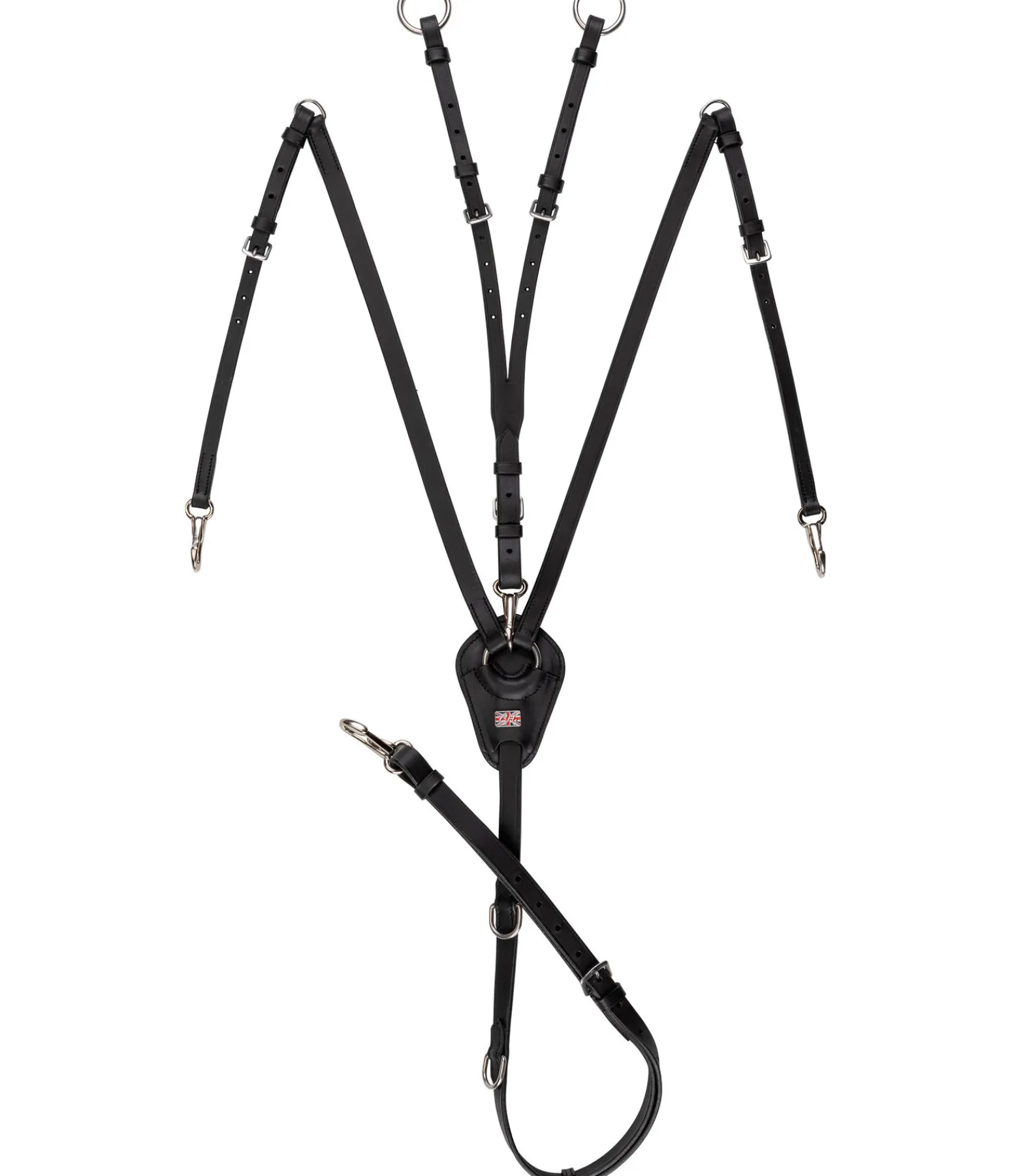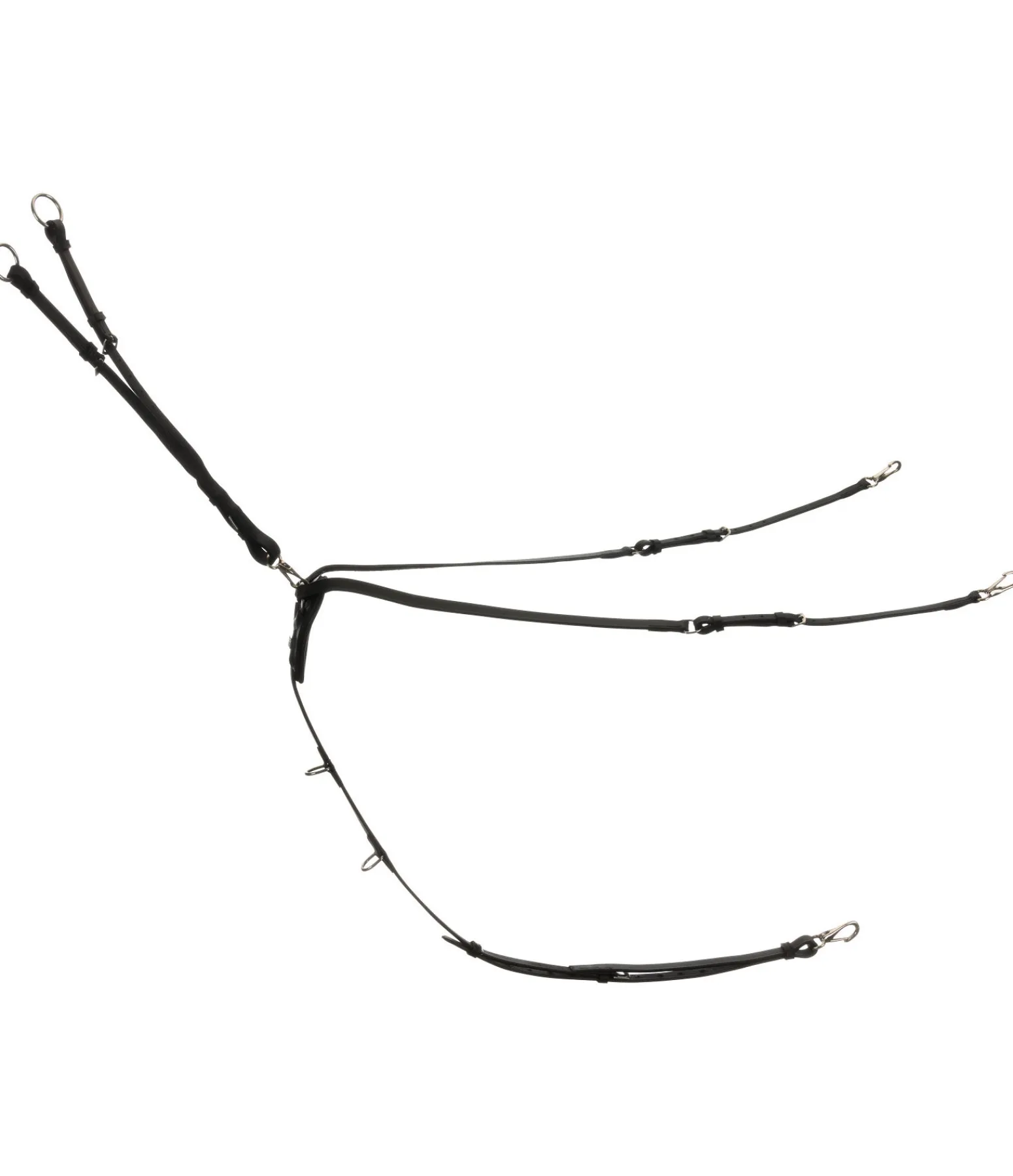 Collier de chasse classique en cuir gras véritable avec doublure extra large et douce au poitrail pour éviter les pressions. Avec trois mousquetons pour une fixation rapide à la sangle et à la selle. Réglable en plusieurs points, fourche de martingale amovible et réglable.
