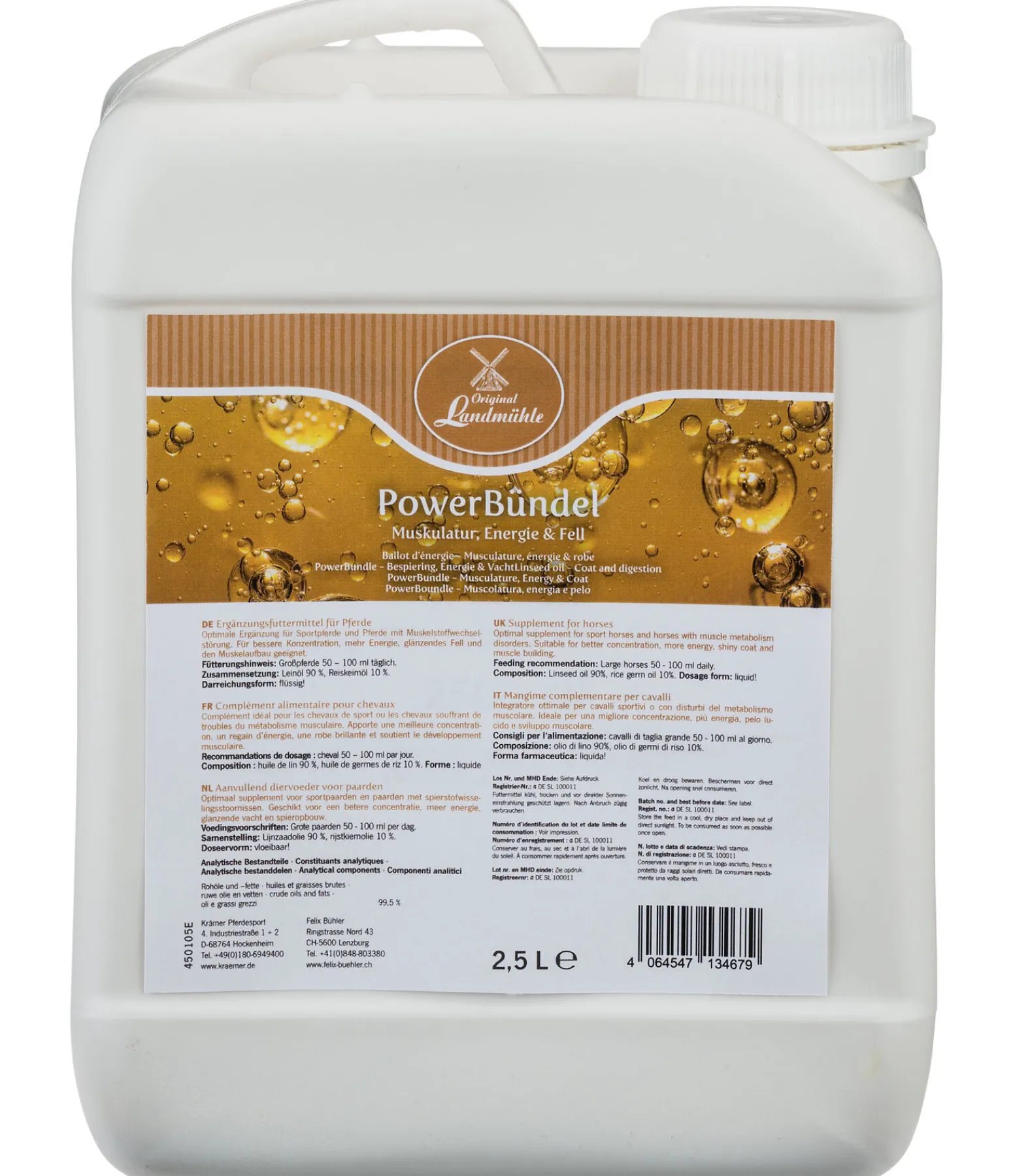 Mélange d’huile de lin pure pressée à froid et d’huile de son de riz. Le concentré d’énergie Original Landmühle est le complément idéal pour les chevaux de sport ou les chevaux souffrant de troubles du métabolisme musculaire. Les huiles sélectionnées sont riches en acides gras essentiels et fournissent ainsi une énergie facilement assimilable. Le cheval obtient plus de puissance et peut travailler en étant mieux concentré. Renforce et soutient la musculature et améliore l’aspect de la robe.