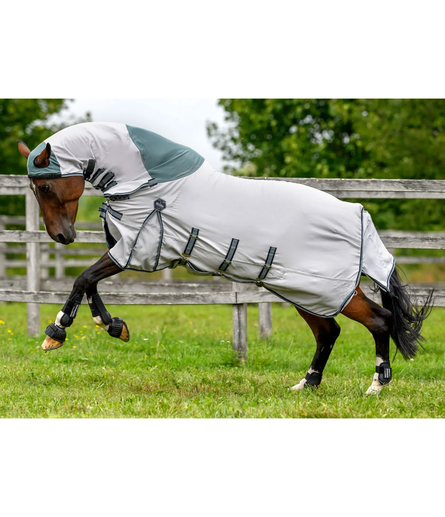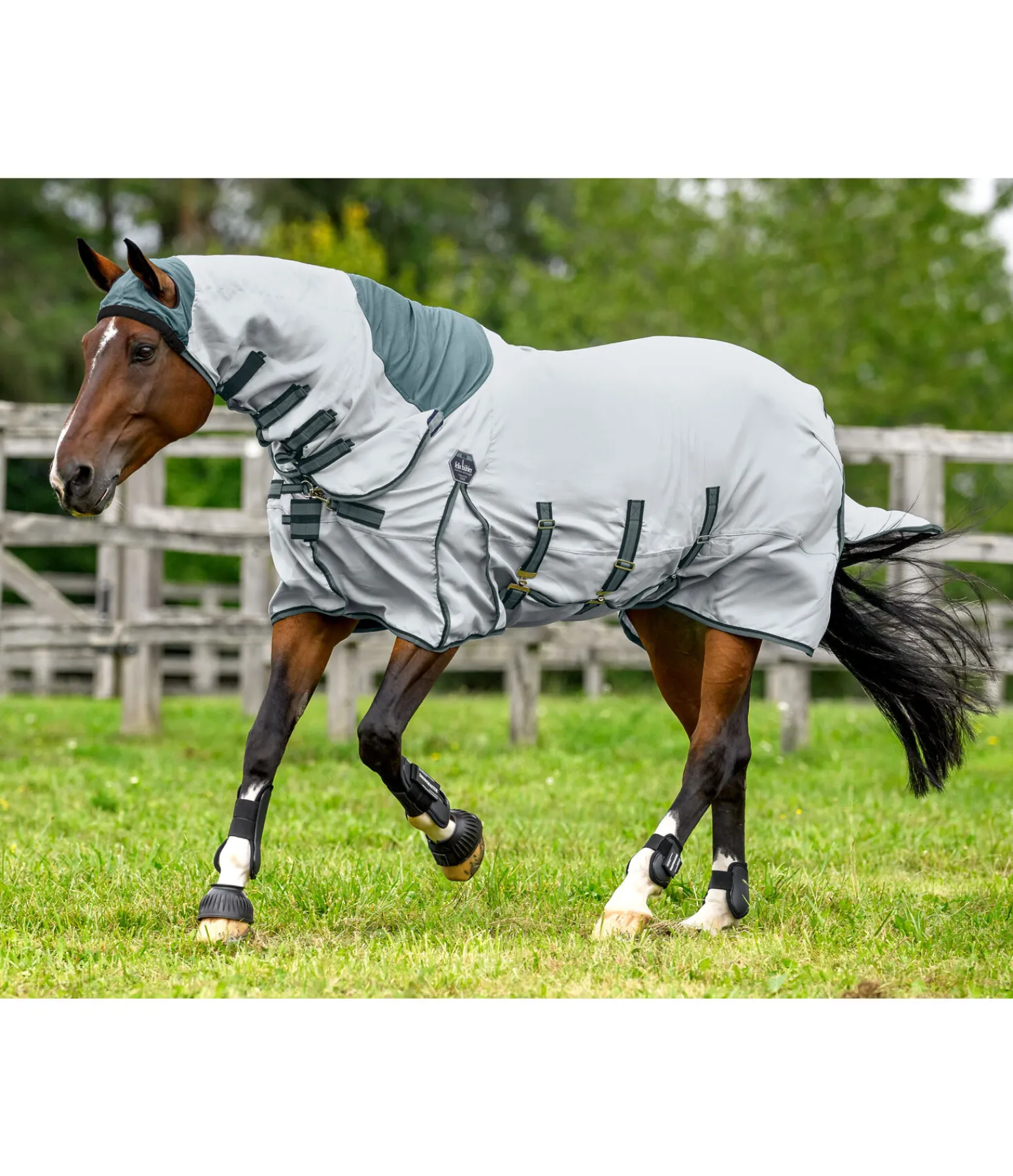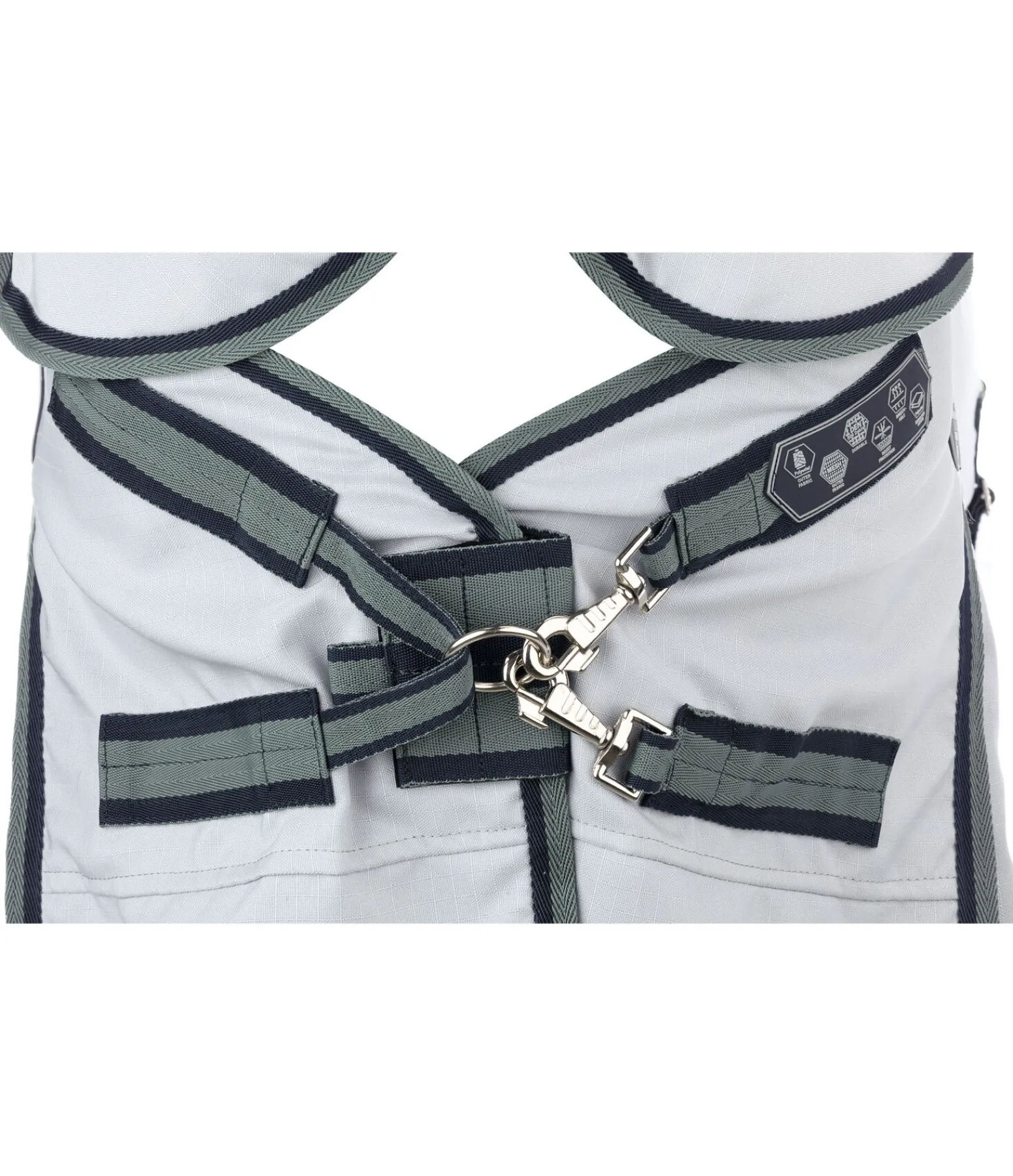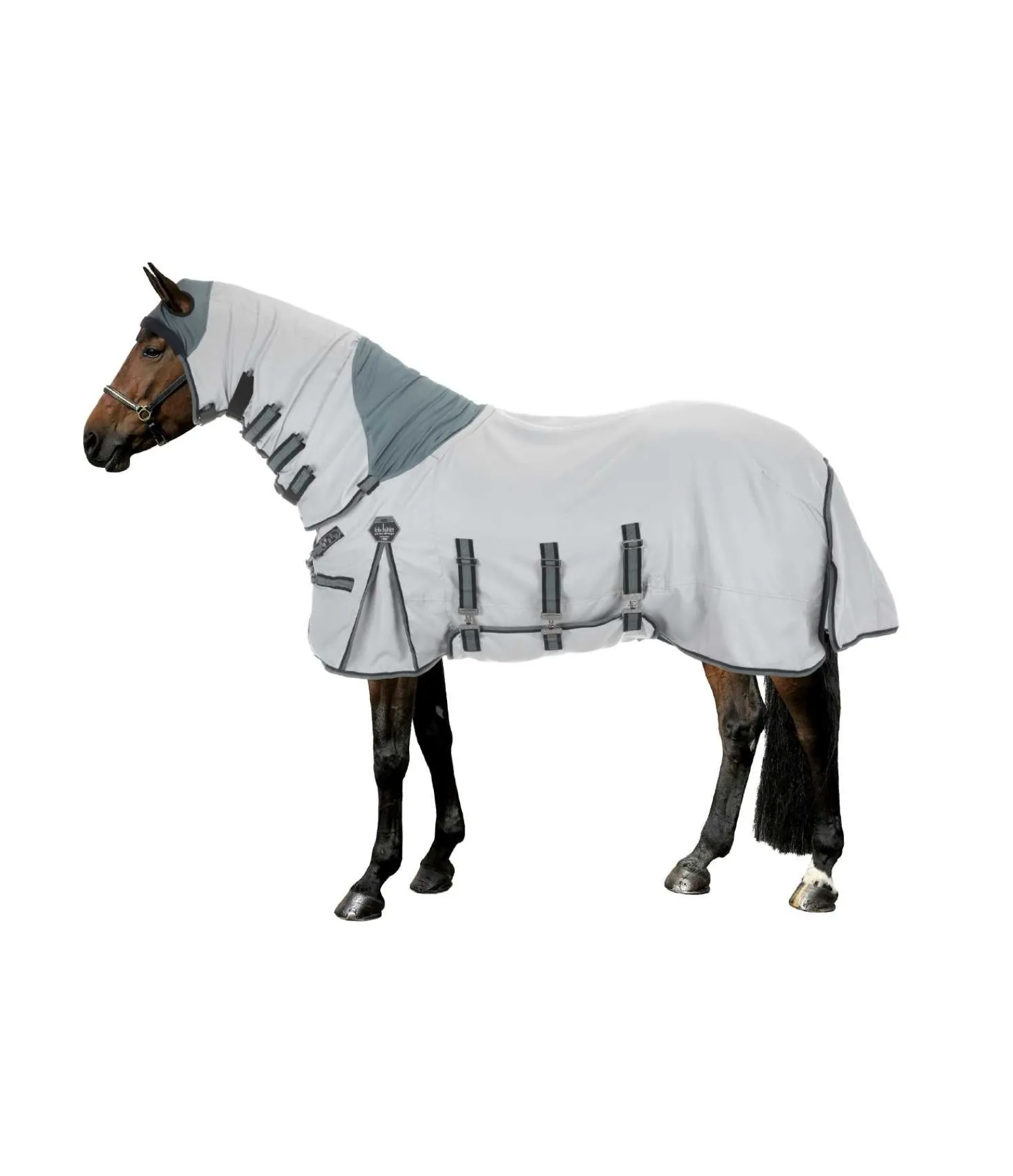 Couverture anti-mouches multifonction spécialement conçue pour les chevaux dermiteux avec long couvre-cou extensible au niveau de la nuque pouvant être fixé sur les oreilles, rabat ventral extra-large avec trois sur-sangles et grand rabat de queue pour une protection maximale. En matière résistante Ripstop 600 deniers, qui empêche même les plus petits insectes de passer. Protège des rayons agressifs du soleil grâce à la protection UV 90 % +. Généreux plis d’aisance aux épaules et empiècement extensible à la base de l’encolure pour une liberté de mouvement optimale, ce qui permet au cheval de brouter sans être gêné par la couverture. Double fermeture de poitrail équilibrée en plusieurs points, avec mousquetons et patte auto-agrippante supplémentaire. Courroie de queue amovible et réglable et anneaux permettant fixer des courroies de cuisses (non fournies).100 % polyester.