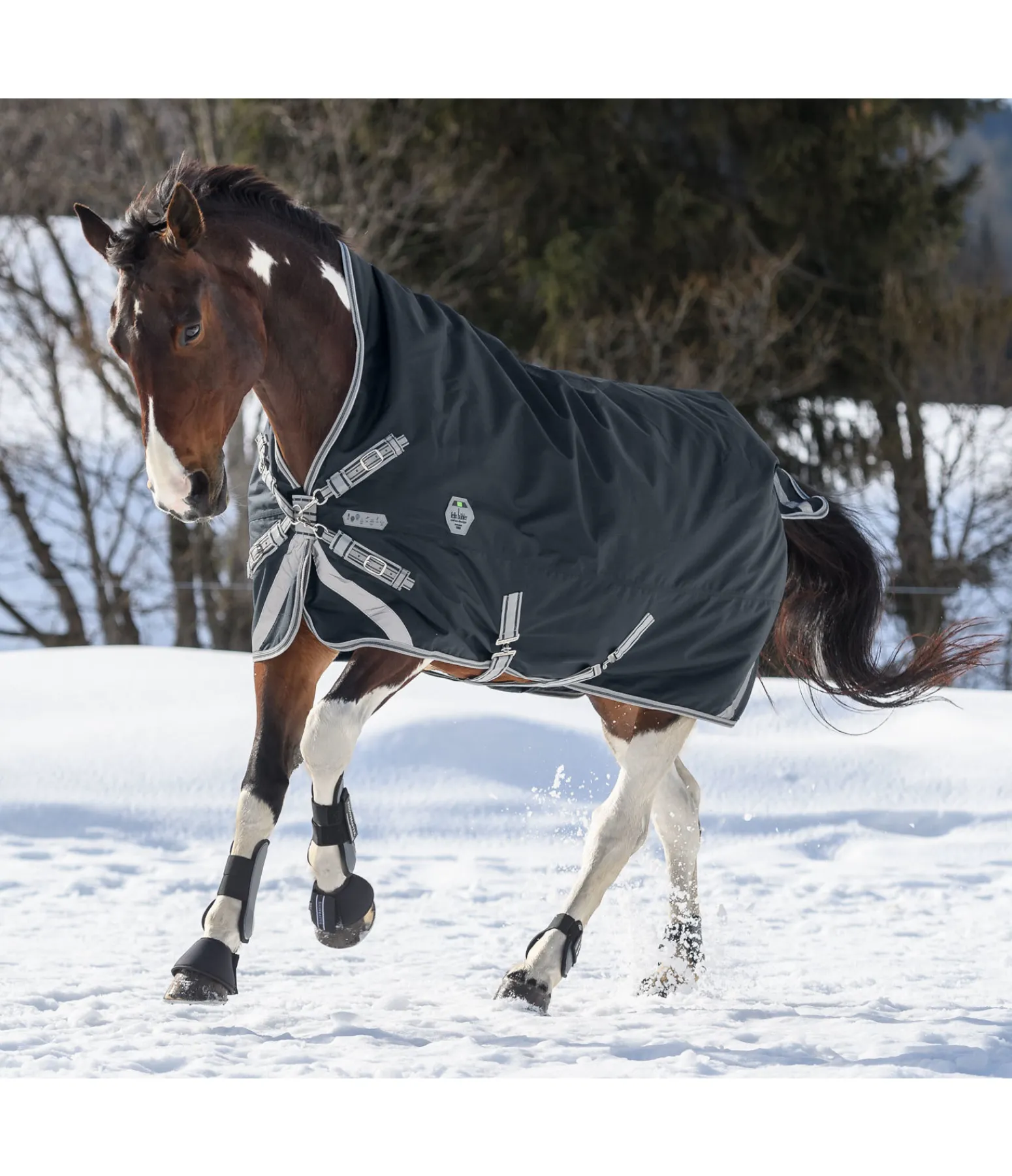 Chemise d’extérieur de grande qualité dans une coupe Highneck protectrice, en matière Ripstop 1.200 deniers particulièrement imperméable (5.000 mm), qui protège efficacement en cas d’averse. Garnissage 200g chaud. Les nombreux éléments réfléchissants tels que le passepoil en bordure et les bandes sur le poitrail, l’arrière-main et le rabat de queue assurent une bonne visibilité et une sécurité optimale. Double fermeture de poitrail équilibrée en plusieurs points avec patte auto-agrippante supplémentaire, sursangles croisées réglables. Doublure lisse protégeant la robe. Anneaux permettant la fixation de courroies de cuisses (non incluses). Rabat de queue et courroie de queue réglable. 100 % polyester.