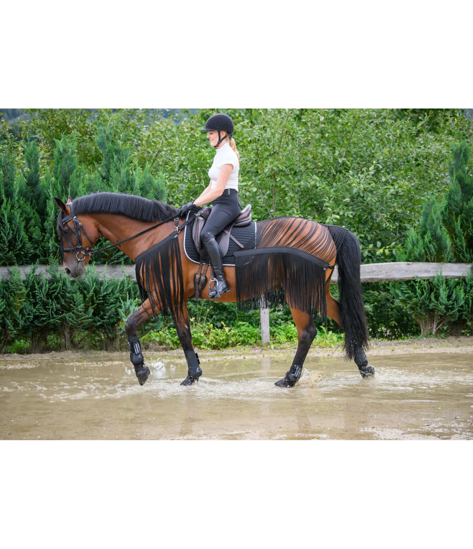 Couvre-reins innovant avec franges anti-mouches au niveau de la croupe et des flancs pour des sorties en toute tranquillité, pour le travail au sol ou pour le travail à la longe. Sangle élastiquée réglable pour fixation par patte auto-agrippante aux oeillets de la selle ou du surfaix. Alternative légère et parfaite à la couverture anti-mouche. Peut être utilisé seul ou assorti au collier de chasse anti-mouches SHOWMASTER pour une protection complète contre les mouches et autres nuisibles. 100 % polyester.