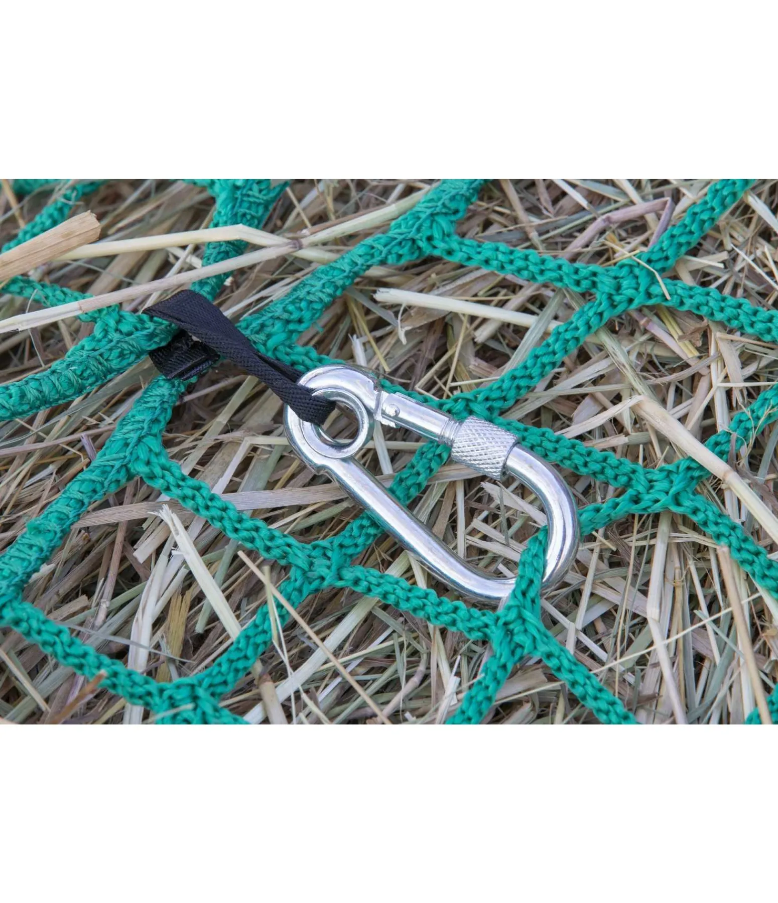 Un filet à foin grand format facile à remplir par le haut et facile à accrocher au moyen des quatre mousquetons de sécurité. Ces mousquetons sont spécialement conçus pour réduire au maximum le risque de blessure pour le cheval. Idéal pour nourrir plusieurs chevaux dans des écuries ouvertes ou des enclos extérieurs. Mailles 4 x 4 cm. 150 x 60 cm. 10 kg.