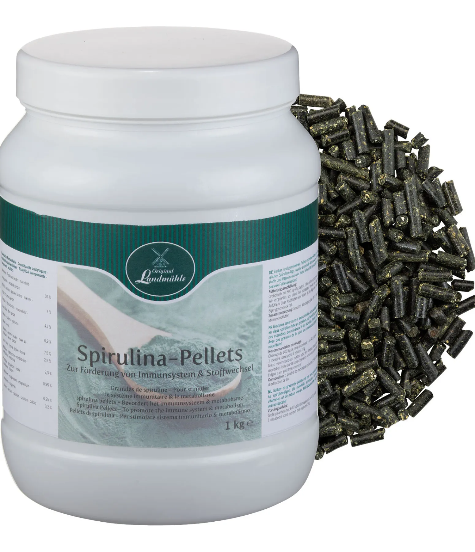 Nous recommandons de donner les granulés de spiruline Original Landmühle aux chevaux en perte d’état ou âgés qui ont besoin d’un apport supplémentaire en substances nutritives ou aux chevaux qui sont en train de développer leur musculature ou qui ont des problèmes pour faire du muscle en raison de maladies comme la myopathie par exemple. Lors de la mue saisonnière, cet aliment peut également être un complément judicieux à l’alimentation de base. La spiruline contenant près de 50 % de protéines, ce produit est déconseillé aux chevaux qui ont un régime pauvre en protéines.