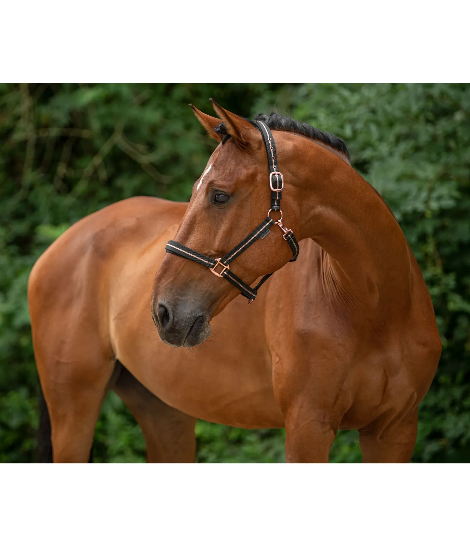 Licol tendance avec rayure en fil métallisé scintillant et bouclerie assortie. Têtière et muserolle avec doublure moelleuse en caoutchouc chloroprène. Têtière facile à réglable. 100 % polypropylène.