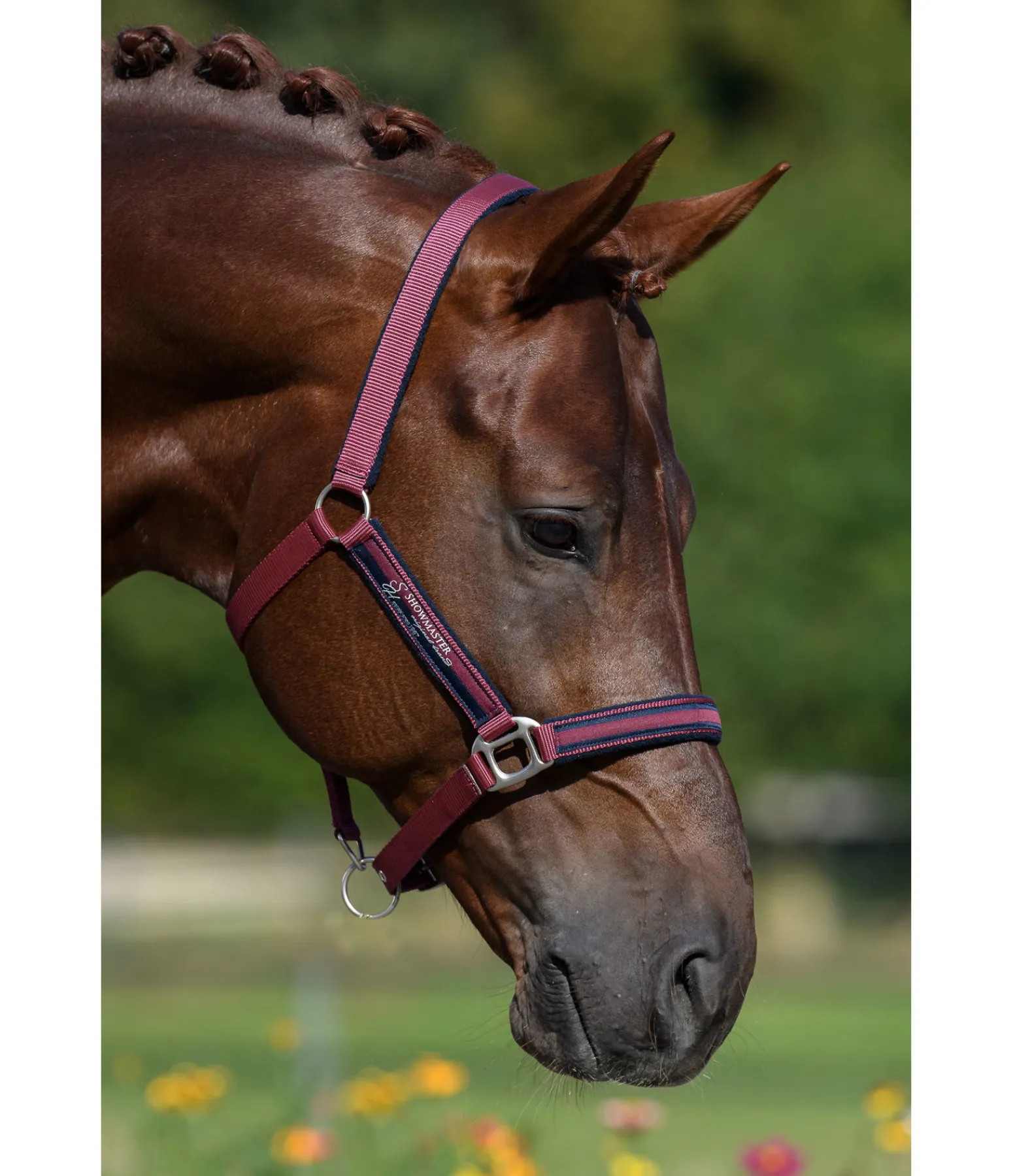 Licol simple bicolore. Têtière, montants et muserolle avec doublure douce en tissu éponge. Têtière et muserolle réglables. Bouclerie mate argentée. Licol 100 % polypropylène, doublure 100 % polyester.