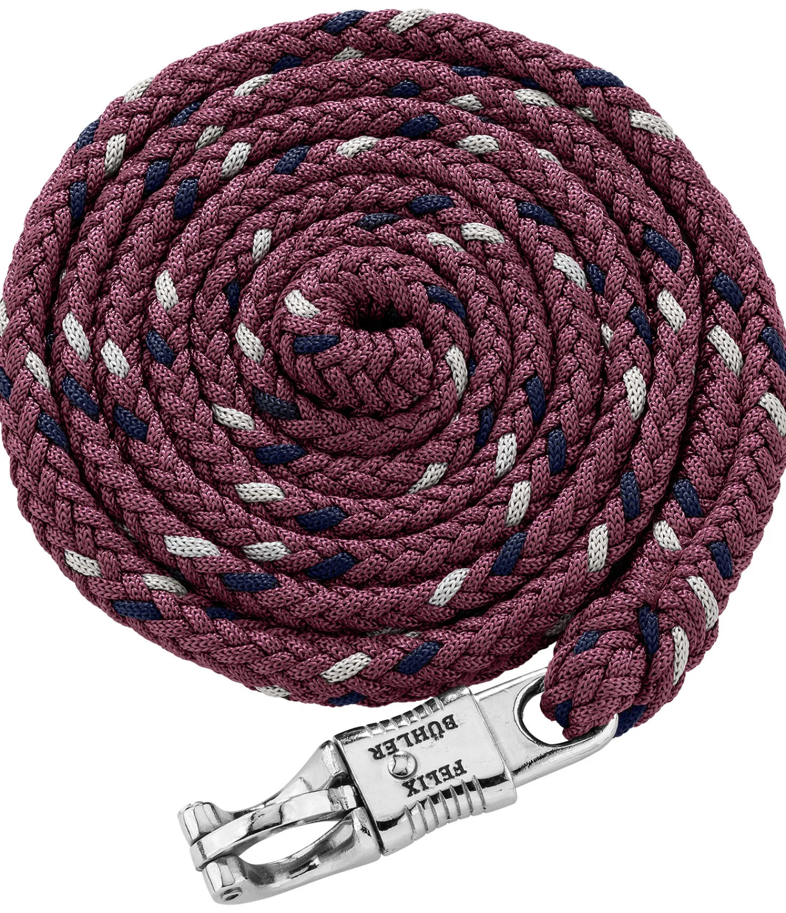 Longe tressée tricolore solide avec mousqueton anti-panique. 2 m. 100 % polyester. Assortie au licol 310057.