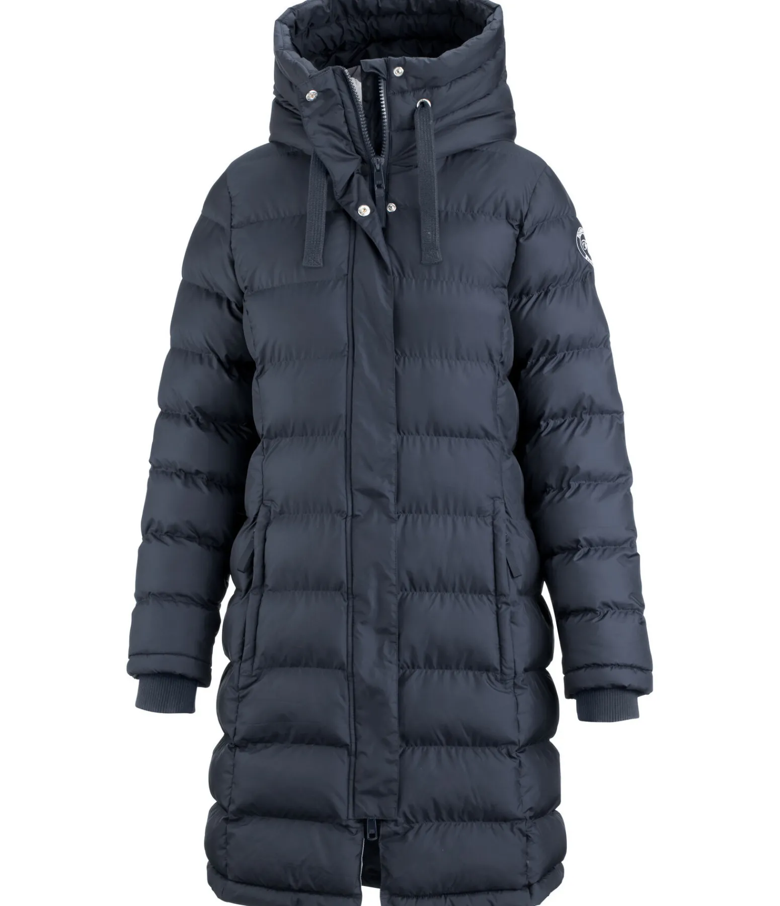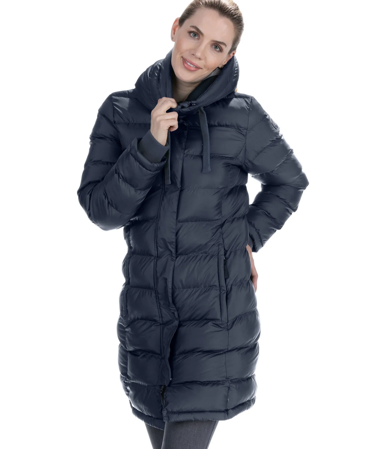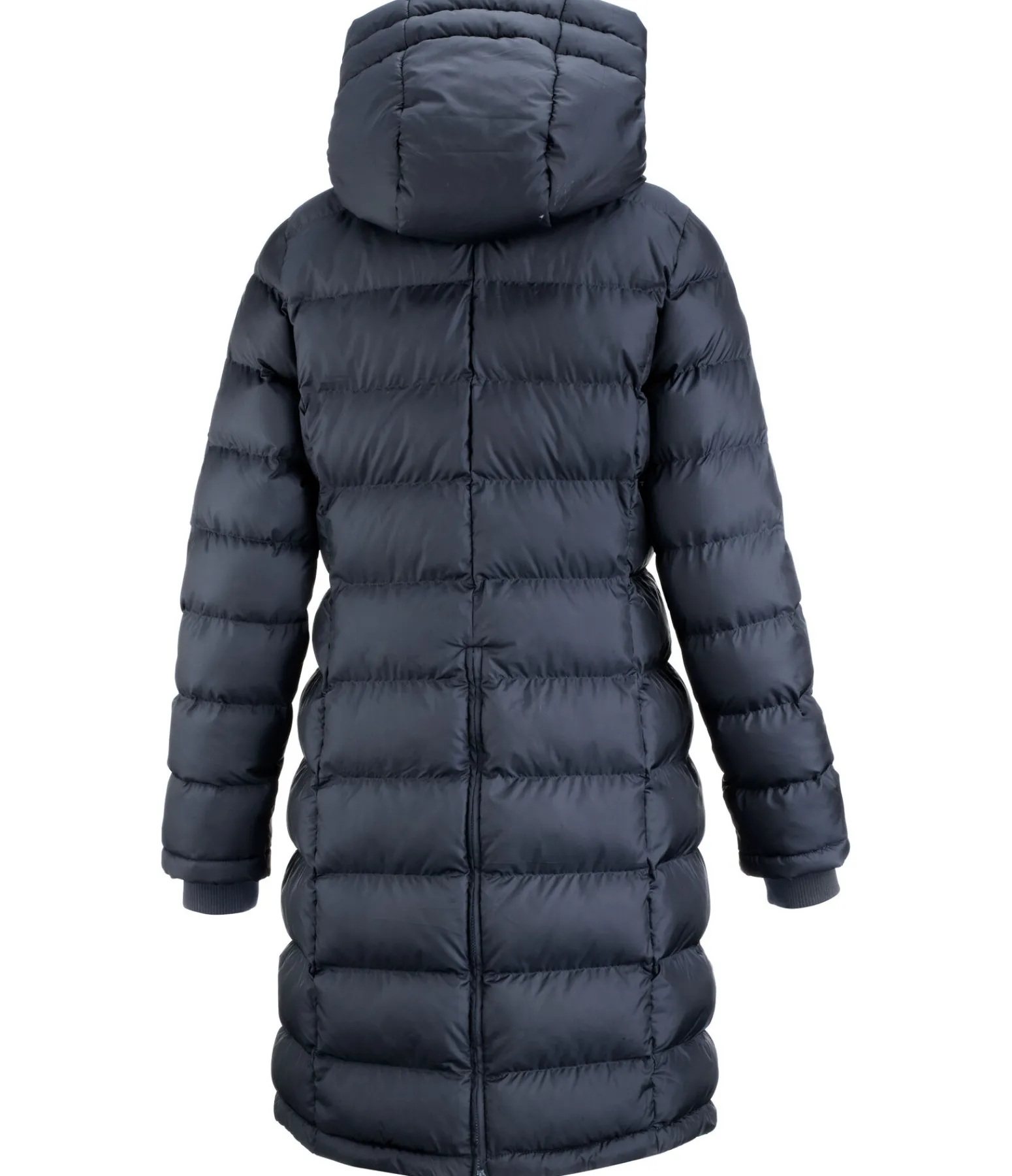 Manteau tendance long et extra chaud. Garnissage doux imitation duvet. Col montant. Capuche réglable avec système d’attache dans le dos. Fermeture à glissière double sens dissimulée. Deux poches latérales zippées dissimulées et doublées de polaire douce. Finition bord-côte en bas des manches. Longue fente cavalière zippée à l’arrière. Broderie Felix Bühler sur la manche. 100 % polyester.