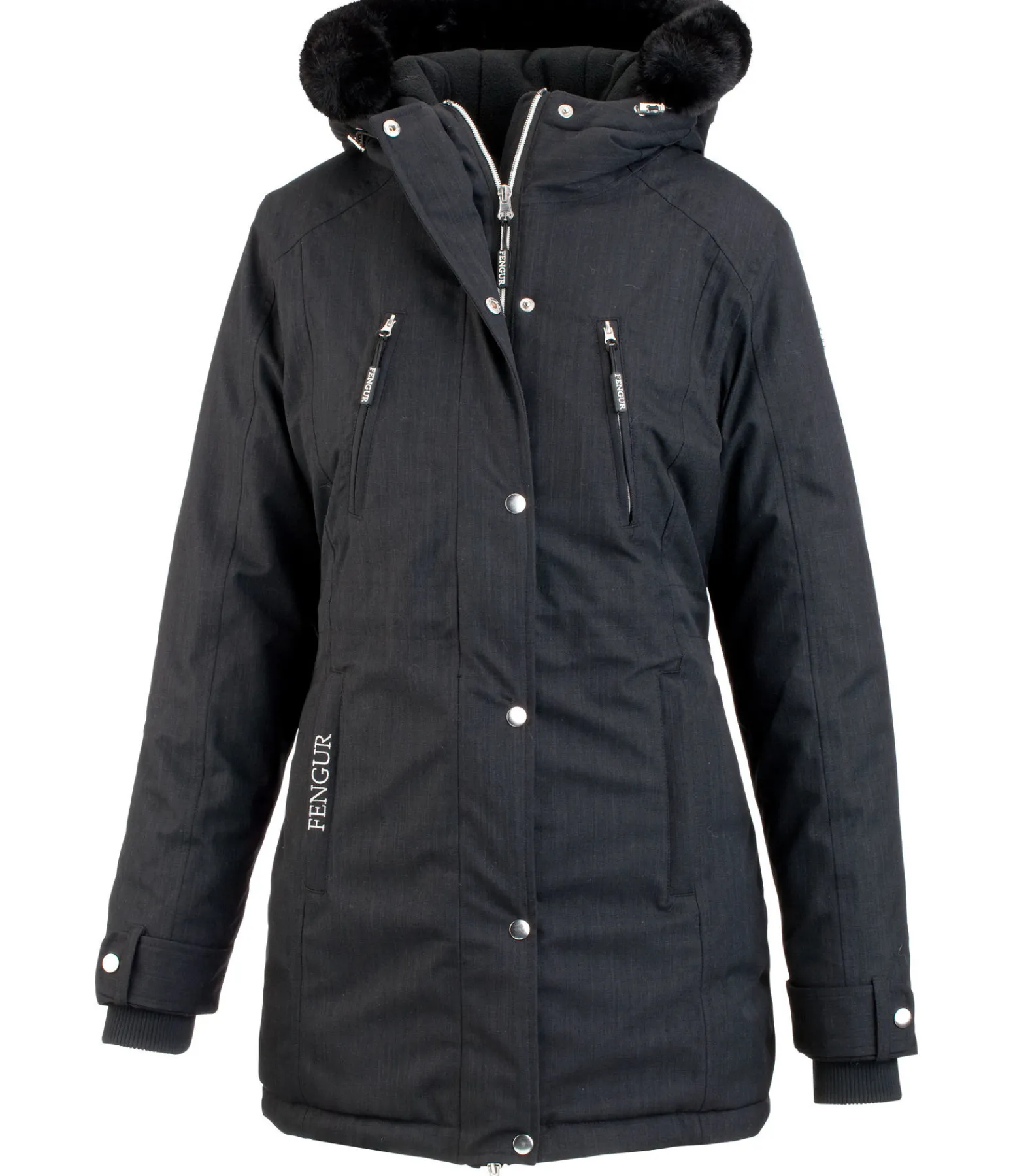 Manteau d’équitation technique avec doublure en polaire chaude. La capuche réglable peut être attachée dans le dos avec un bouton-pression et le col en imitation fourrure est amovible. Imperméable (3.000 mm), coupe-vent, très chaud et garnissage épais. Cordon de serrage aux hanches. Fente cavalière zippée dans le dos, fermeture à glissière double sens dissimulée, 2 poches zippées, 2 poches poitrine zippées, 1 poche intérieure zippée, poignets réglables. 100 % polyester.