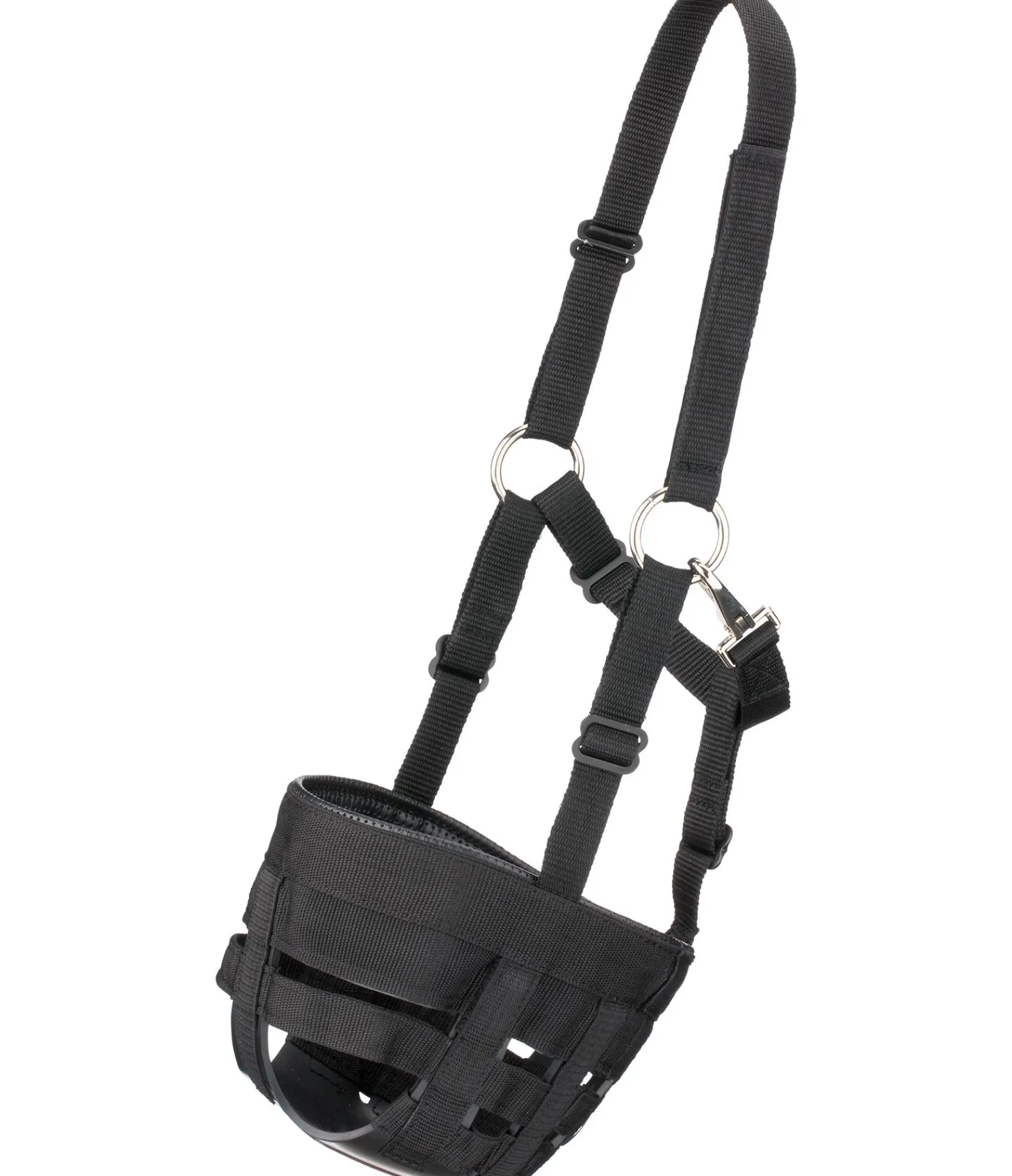 Empêche le cheval de manger trop ou trop vite au pré. Conception confortable avec un rembourrage doux à la têtière ainsi qu’à l’intérieur de la muselière. Avec découpe au niveau des naseaux. Fond du panier en caoutchouc robuste et souple. Par mesure de sécurité, la lanière passant par la nuque se ferme par une double patte auto-agrippante qui assure un bon maintien mais s’ouvre rapidement si le cheval s’accroche quelque part. L’anneau au bas du panier est à utiliser seulement pour effectuer de courtes distances et ne doit pas être utilisé pour l’attache. Nombreux réglages pour un ajustement parfait.