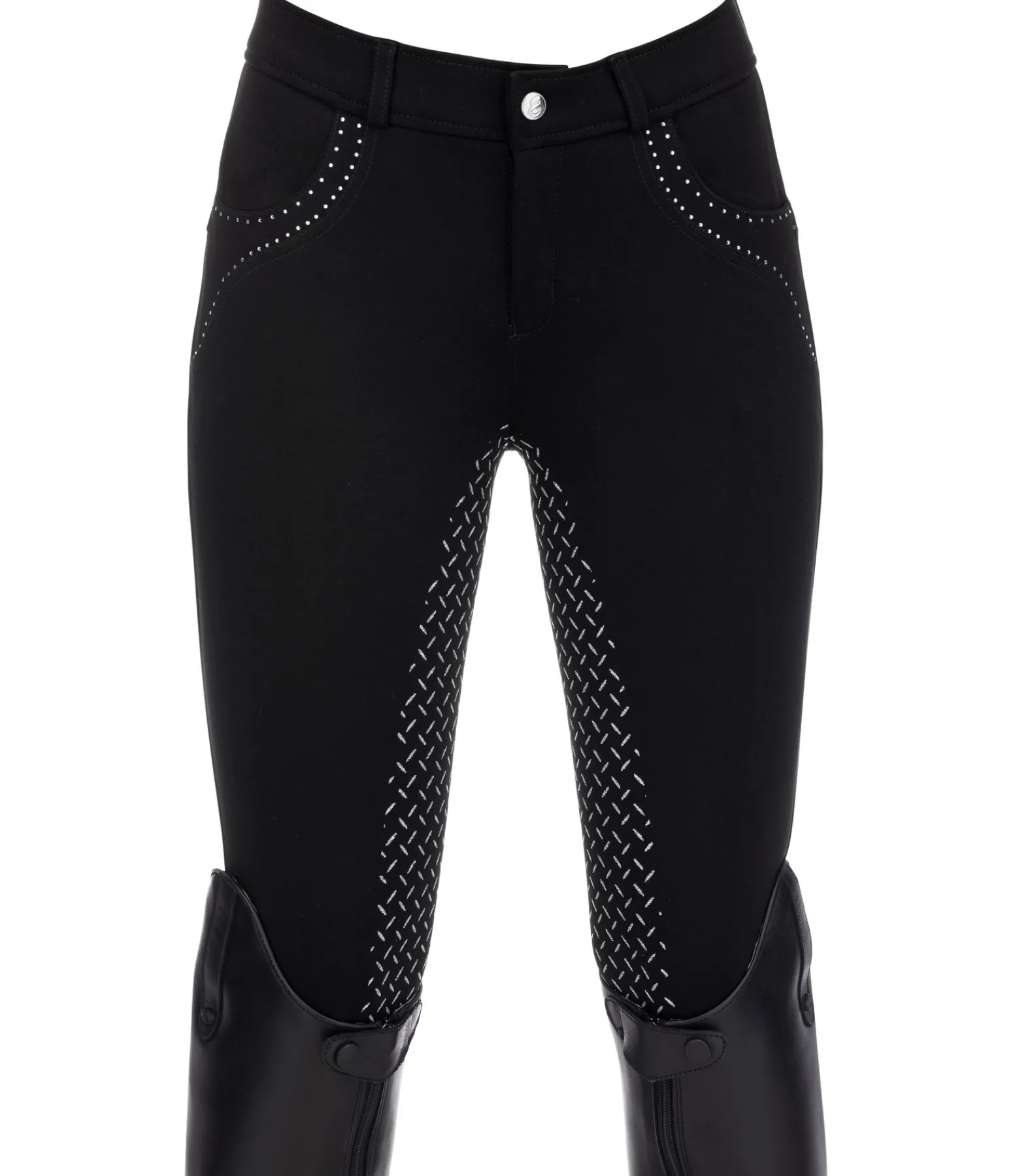 Pantalon d’équitation. Fond intégral grip en silicone scintillant. Matière stretch respirante, extensible dans 4 directions et ultra confortable. Strass sur les poches avant. Bas de jambe extensible sans patte auto-agrippante. 68 % viscose, 27 % polyamide, 5 % élasthanne.