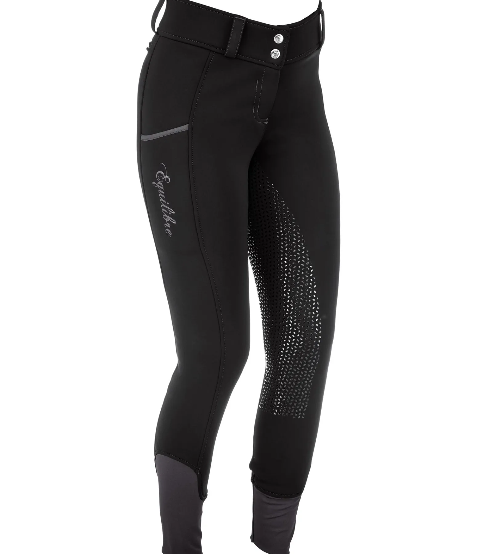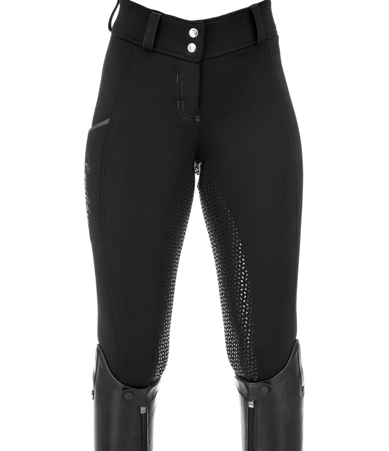 Legging d’équitation confortable avec fond intégral grip en silicone. Matière extensible lisse à l’extérieur et confortable à l’intérieur. Ceinture extra large élastiquée. Une poche zippée pour téléphone portable sur la cuisse. Bas de jambe extensible sans patte auto-agrippante. 86 % polyester, 14 % élasthanne.