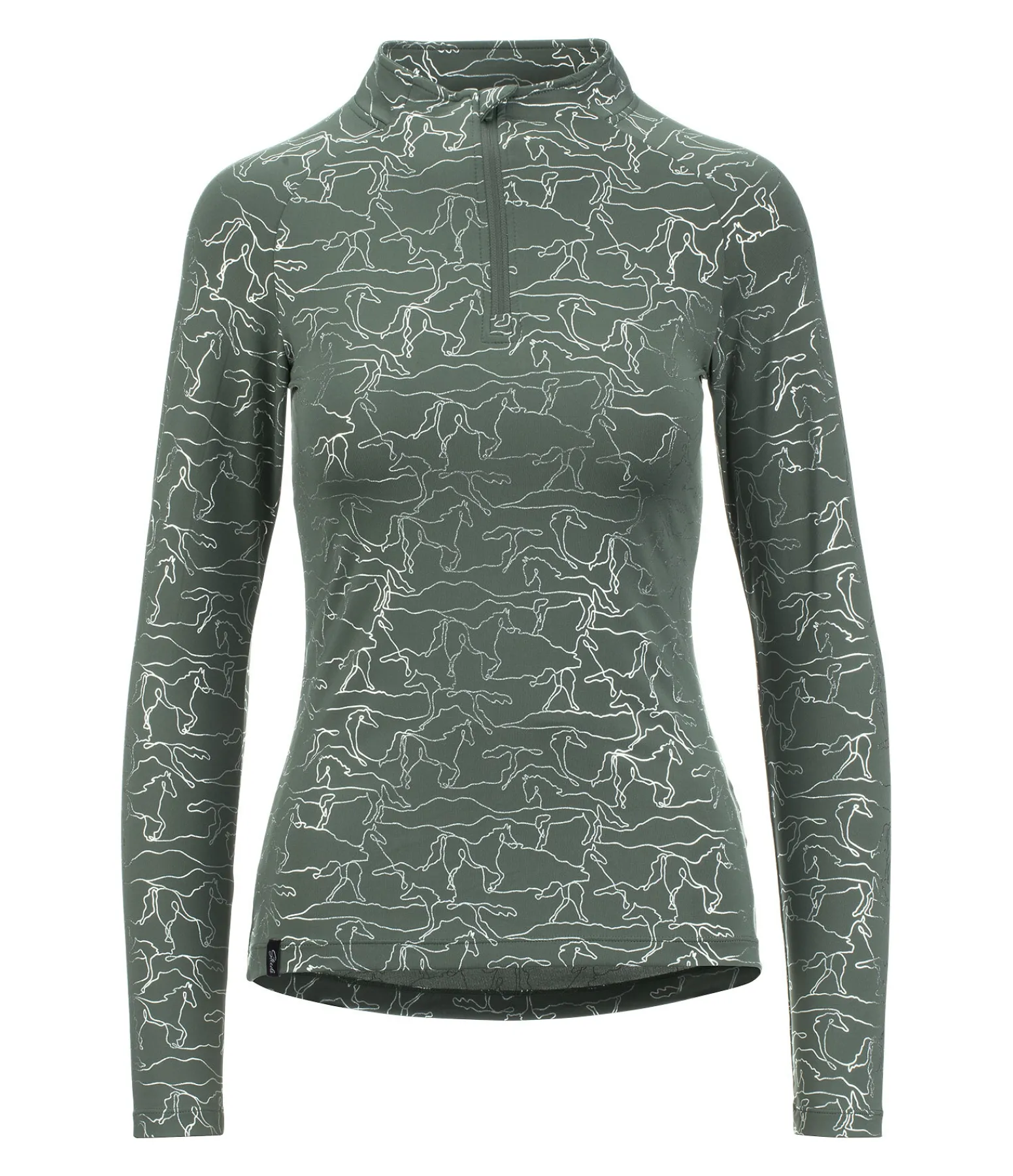 T-shirt technique à manches longues. Imprimé métallisé cheval all-over. Manches raglan. Col montant zippé avec protège-menton. Matière respirante. Séchage rapide. 88 % polyester, 12 % élasthanne.
