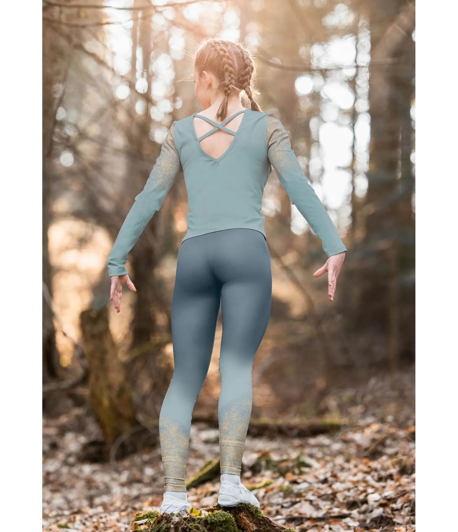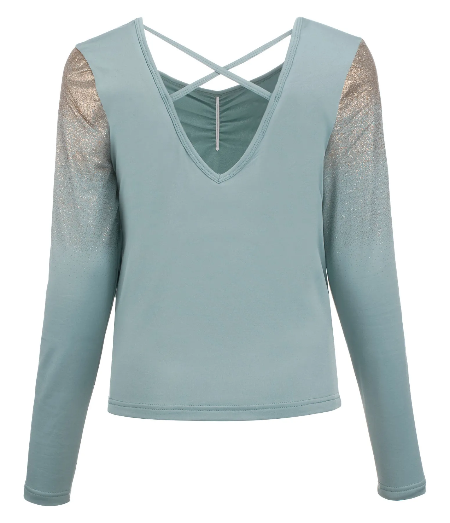 T-shirt avec large col rond. Intérieur molletonné et chaud. Découpe en V avec lanières croisées dans le dos. Superbe dégradé scintillant rose doré partant de l’épaule. Matière respirante à séchage rapide. 80 % nylon, 20 % élasthanne.