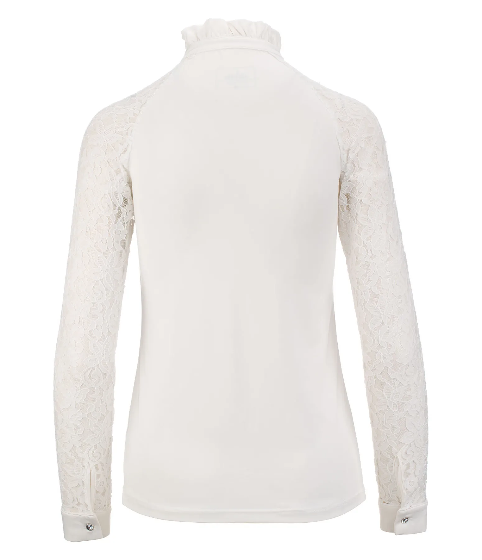 Élégant T-shirt de concours à manches longues en dentelle douce avec col à volants et boutons à strass. Respirant et à séchage rapide. 88 % polyester, 12 % élasthanne. Recommandation : laver à la main ou dans un sac de lavage.