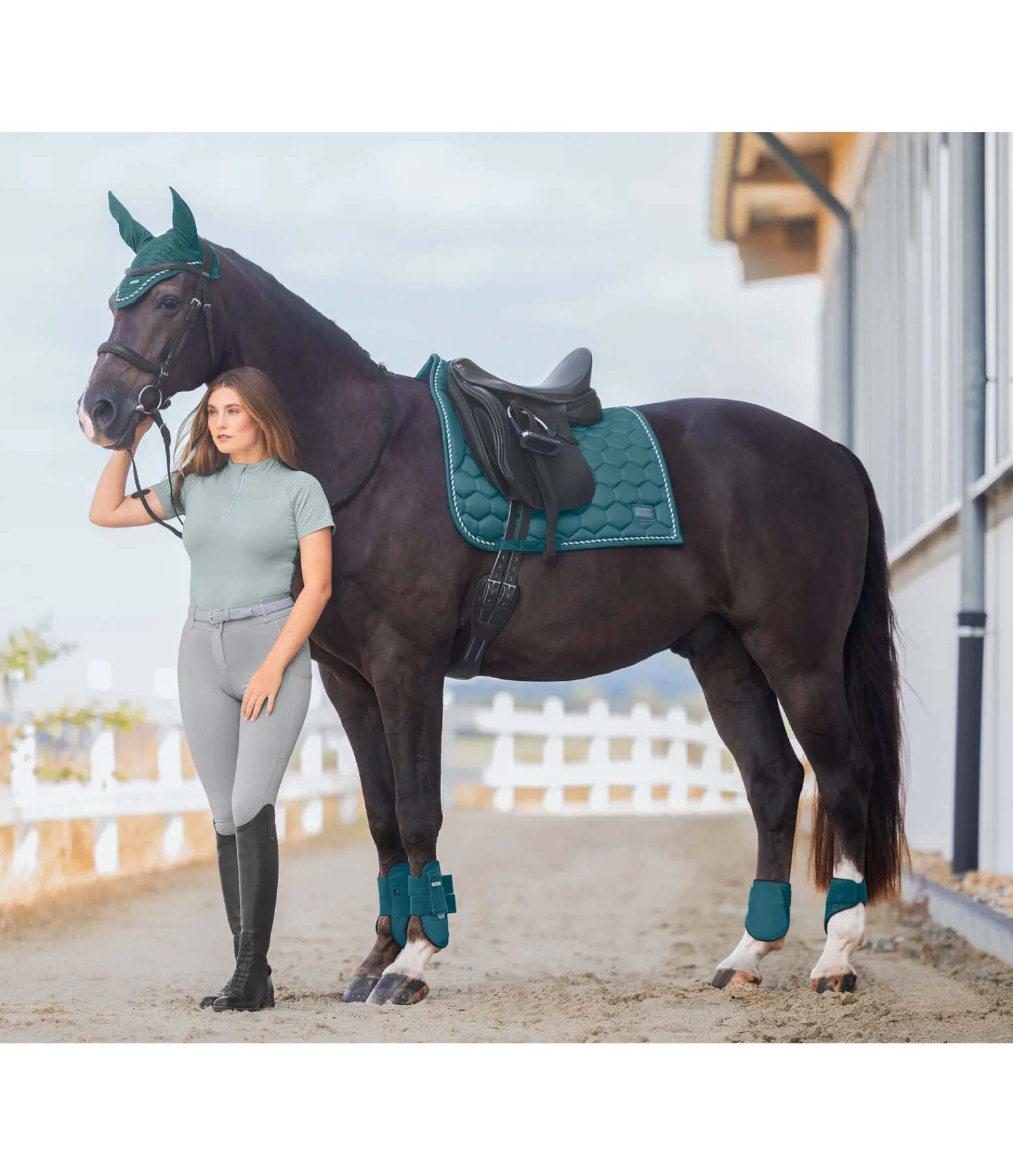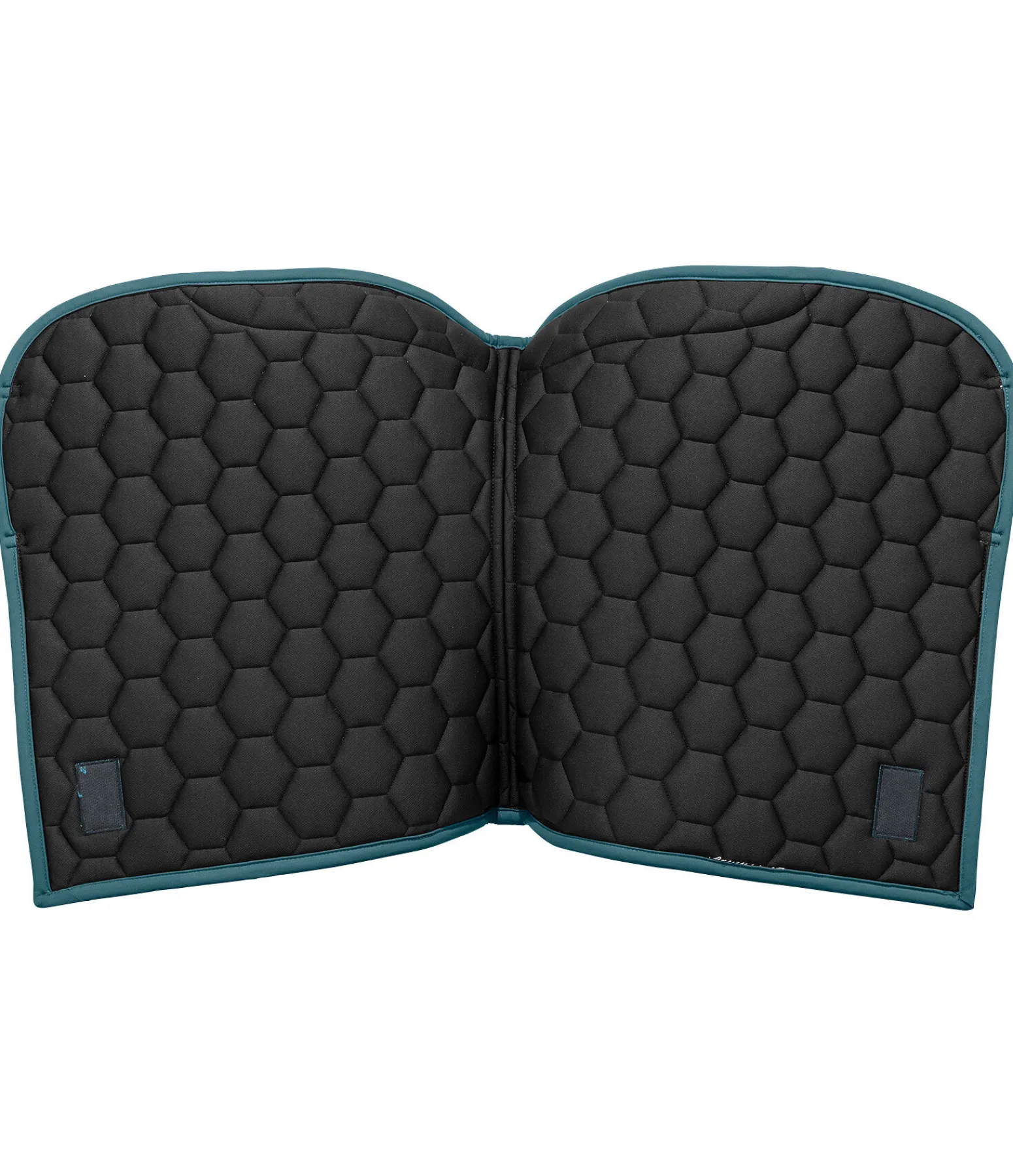 Tapis de selle avec rembourrage à l’avant permettant de garder la selle en place sans passants de contre-sanglons. Coupe sportive avec angle droit et surpiqûre en losanges. Dessus en matière lisse anti-salissures, cordon décoratif de couleur assortie et plaque logo métallique classique. Passants de sangle avec patte auto-agrippante pratique. Dessous en Air mesh respirant et absorbant l’humidité. 100 % polyester.