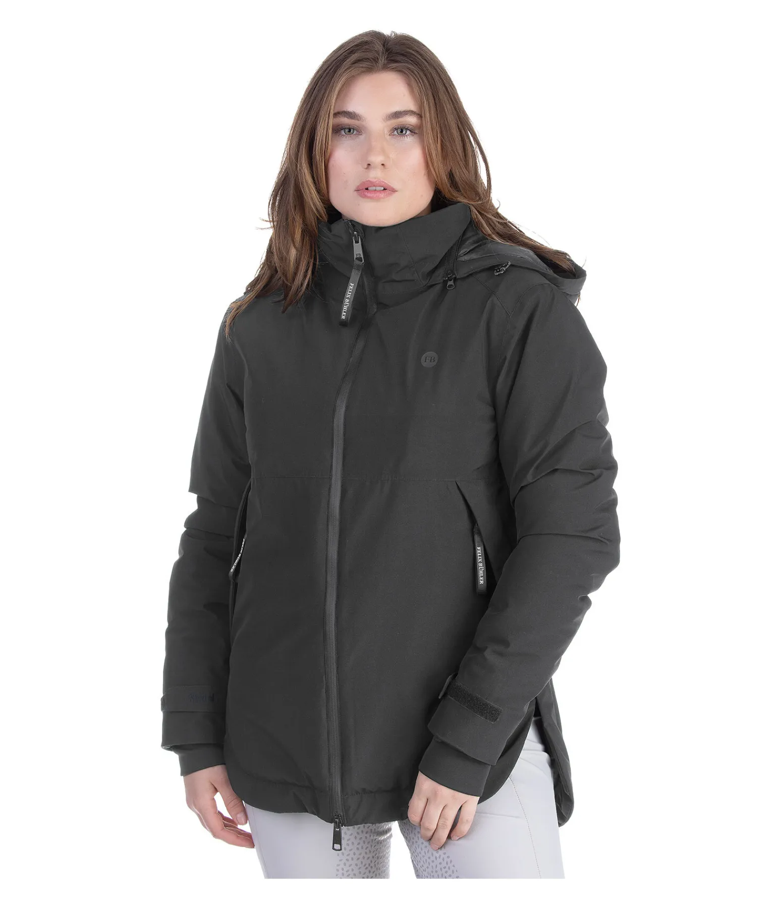 Veste d’équitation avec doublure chaude. Matière respirante, imperméable (10.000 mm) et coupe-vent. Col montant. Capuche amovible et réglable. Bouton-pression pour fixer la capuche dans le dos. Fermeture à glissière double sens étanche avec sous-patte. 2 poches avant zippées et dissimulées. 1 poche intérieure zippée. Bas des manches ajustable, élastiqué et coupe-vent. Bouton-pression sur chaque côté. Coupe plus longue à l’arrière. Imprimé Felix Bühler sur les manches, la capuche et les poignets. 100 % polyester.