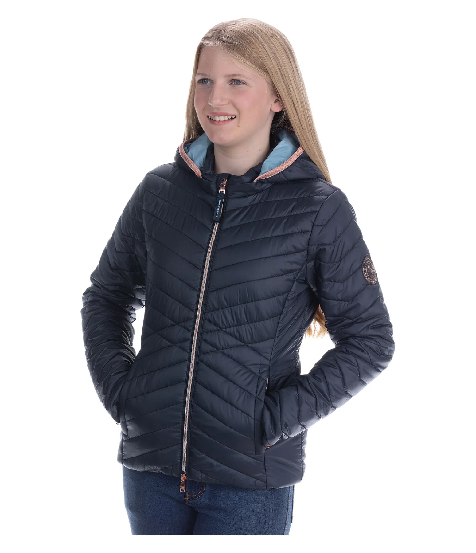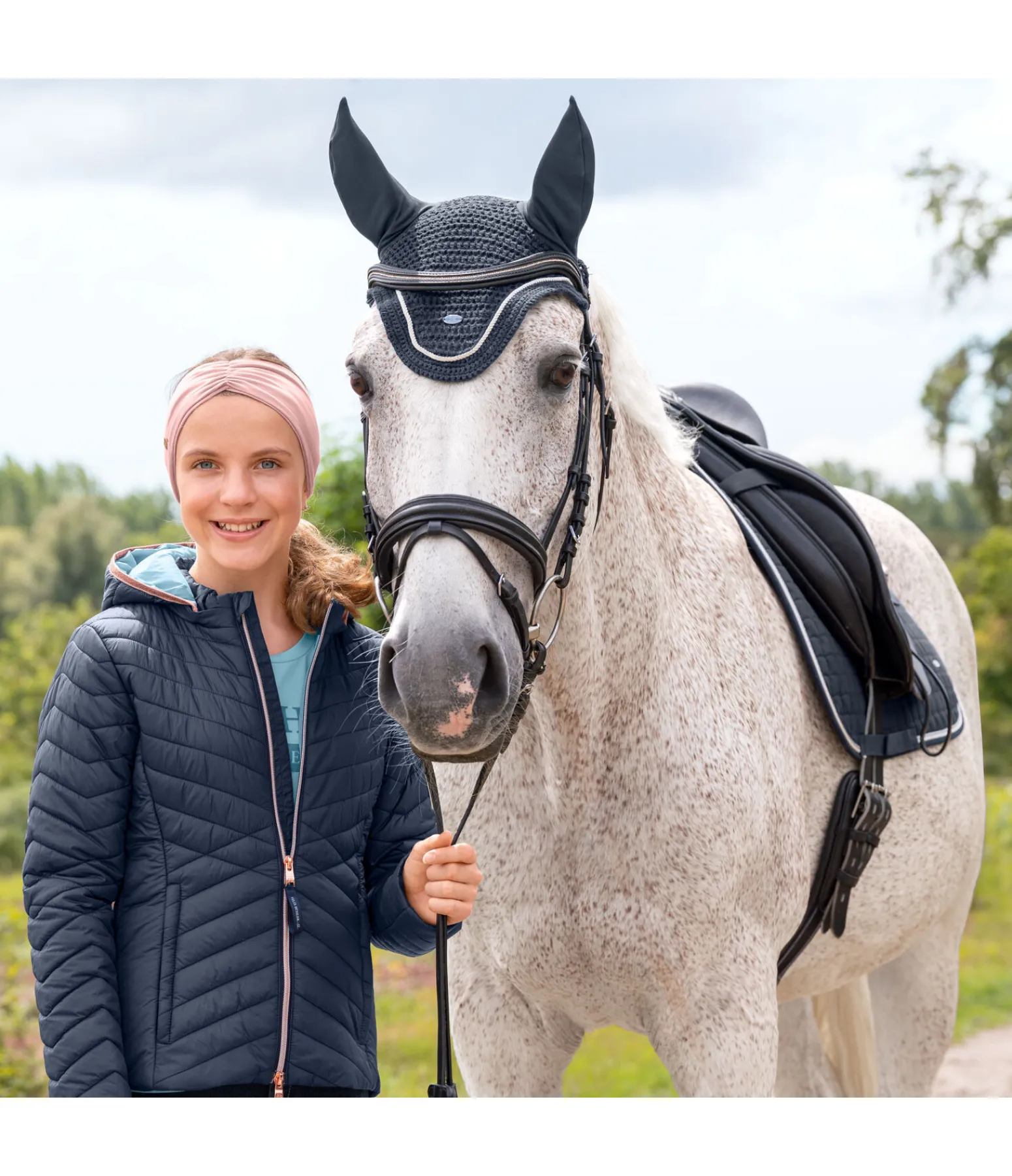 Veste d’équitation à capuche, légèrement matelassée avec garnissage imitation duvet. Doublure intérieure de couleur contrastante. Fermeture à glissière double sens rose doré avec protège-menton. Deux poches zippées latérales dissimulées. Badge logo sur la manche. Capuche avec passepoil rose doré scintillant, amovible par boutons-pression. 100 % nylon, garnissage 100 % polyester.
