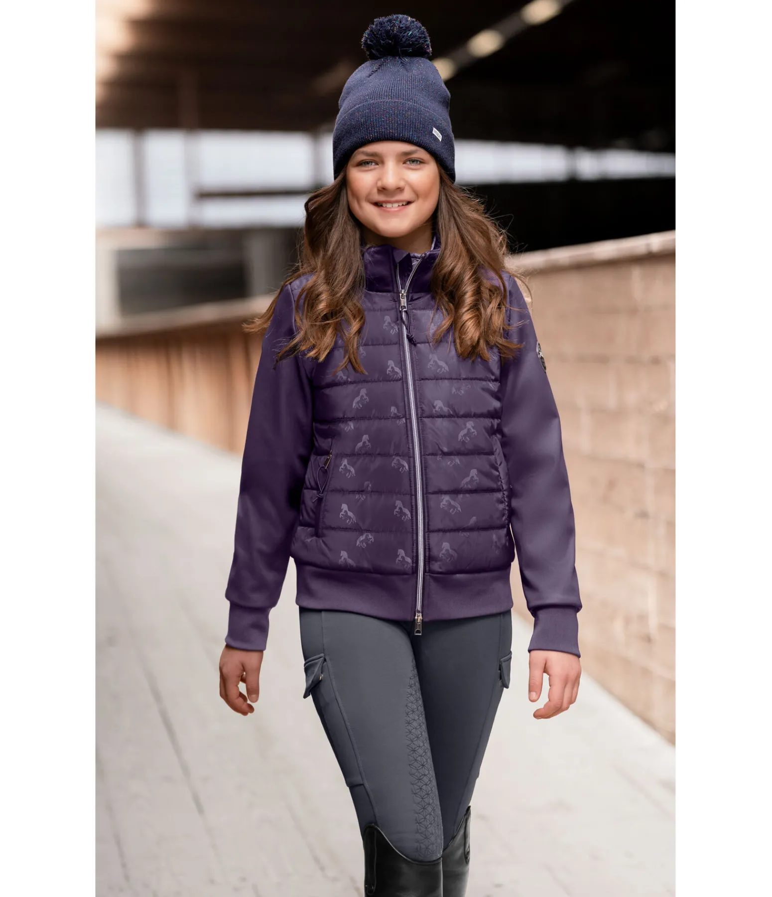 Veste d’équitation softshell technique pour enfant avec inserts matelassés chauds devant et imprimé all-over légèrement chatoyant motif cheval. Déperlante et coupe-vent. Garnissage chaud en imitation duvet. Badge logo sur la manche, fermeture à glissière double sens avec sous-patte et protège-menton, 2 poches avant zippées dissimulées et bas des manches et taille avec finition bord-côte. Capuche amovible, dos et manche en matière softshell douce. Matière extérieure 100 % nylon, inserts 100 % polyester.