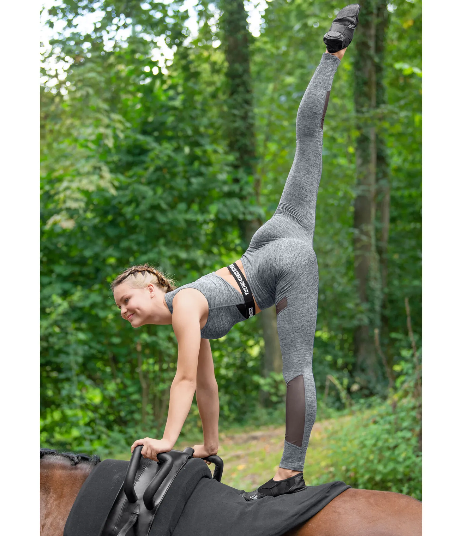 Crop top près du corps avec larges bretelles. Inserts en mesh, au niveau des côtes et des épaules, favorisant la circulation de l’air. Matière respirante et à séchage rapide. Brassière de sport intégrée avec coques amovibles pour un maintien optimal. Il est conseillé de retirer les coques avant le lavage. Bande élastiquée à la taille avec inscription brodée « Vaulting – Acrobatics between heaven & earth ». Découpe croisée travaillée dans le dos. 88 % polyester, 12 % élasthanne (carbone chiné) et 78 % polyester, 22 % élasthanne (aquamarine).