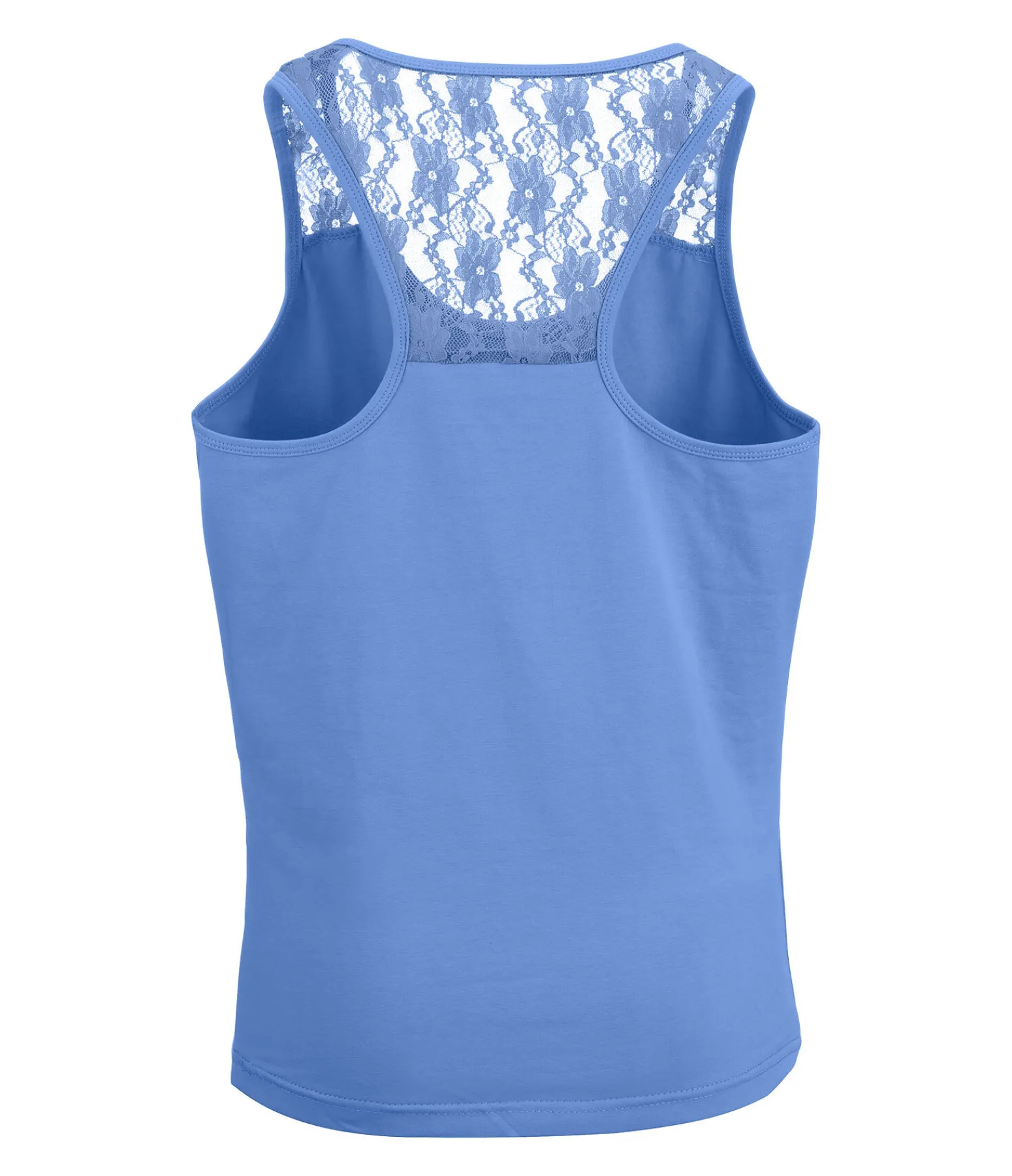 Adorable débardeur pour enfant avec joli insert en dentelle aux épaules et dans le dos. Broderie logo discrète. Matière respirante. 95 % coton, 5 % jersey extensible.