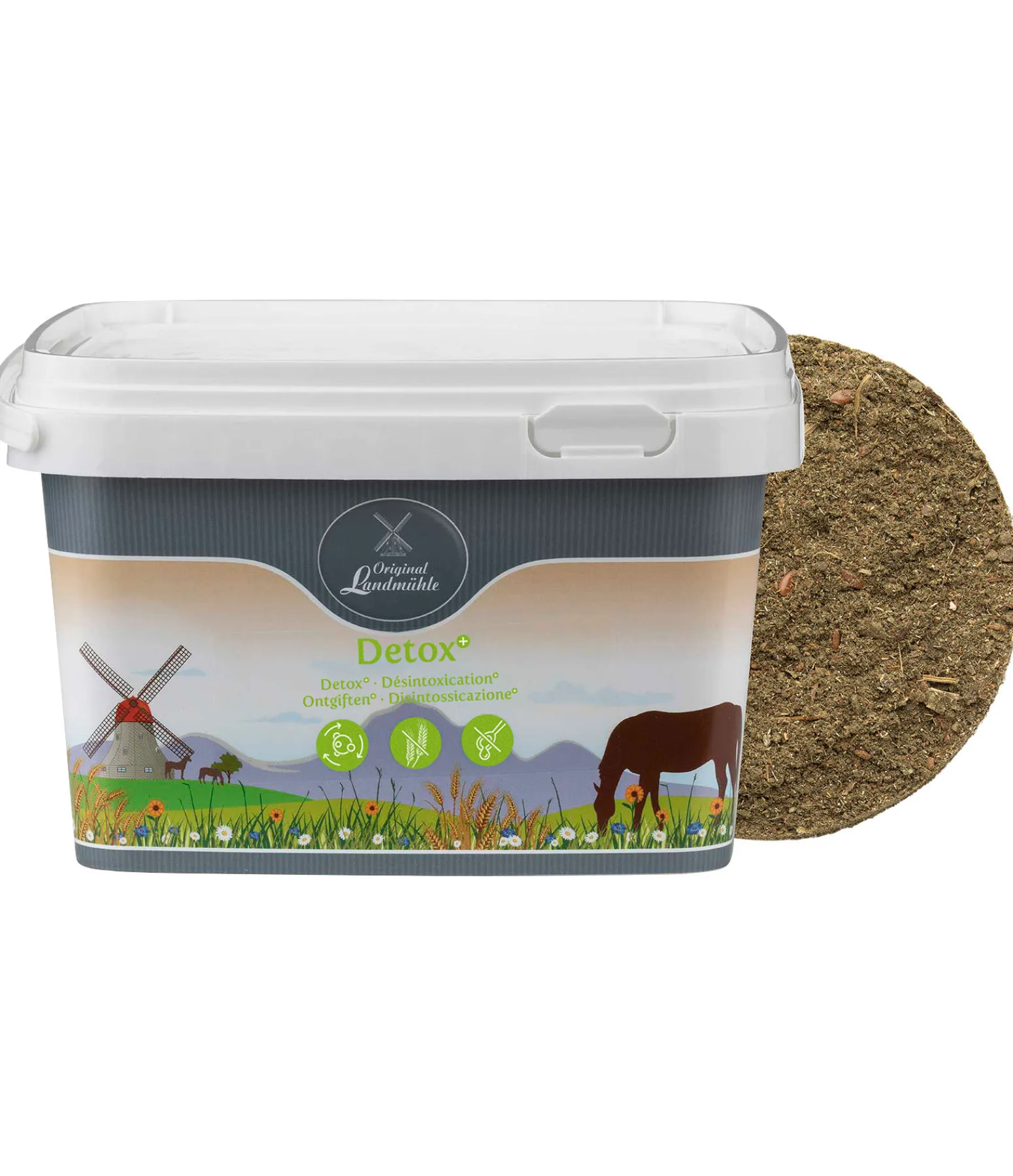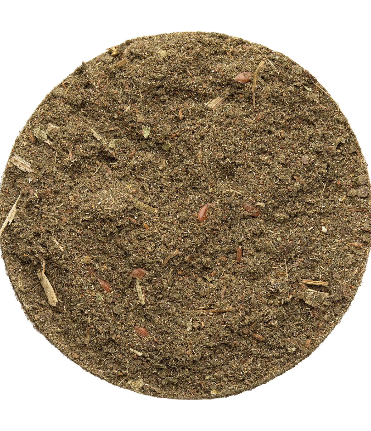 Composition : farine de tourteau de lin, farine de pépins de raisin, drêches, poudre de topinambour, spiruline, chardon-Marie, feuilles d’artichaut, échinacée, pissenlit, ortie, levure de bière, graines de lin, cosses de psyllium, farine d’algues marines.