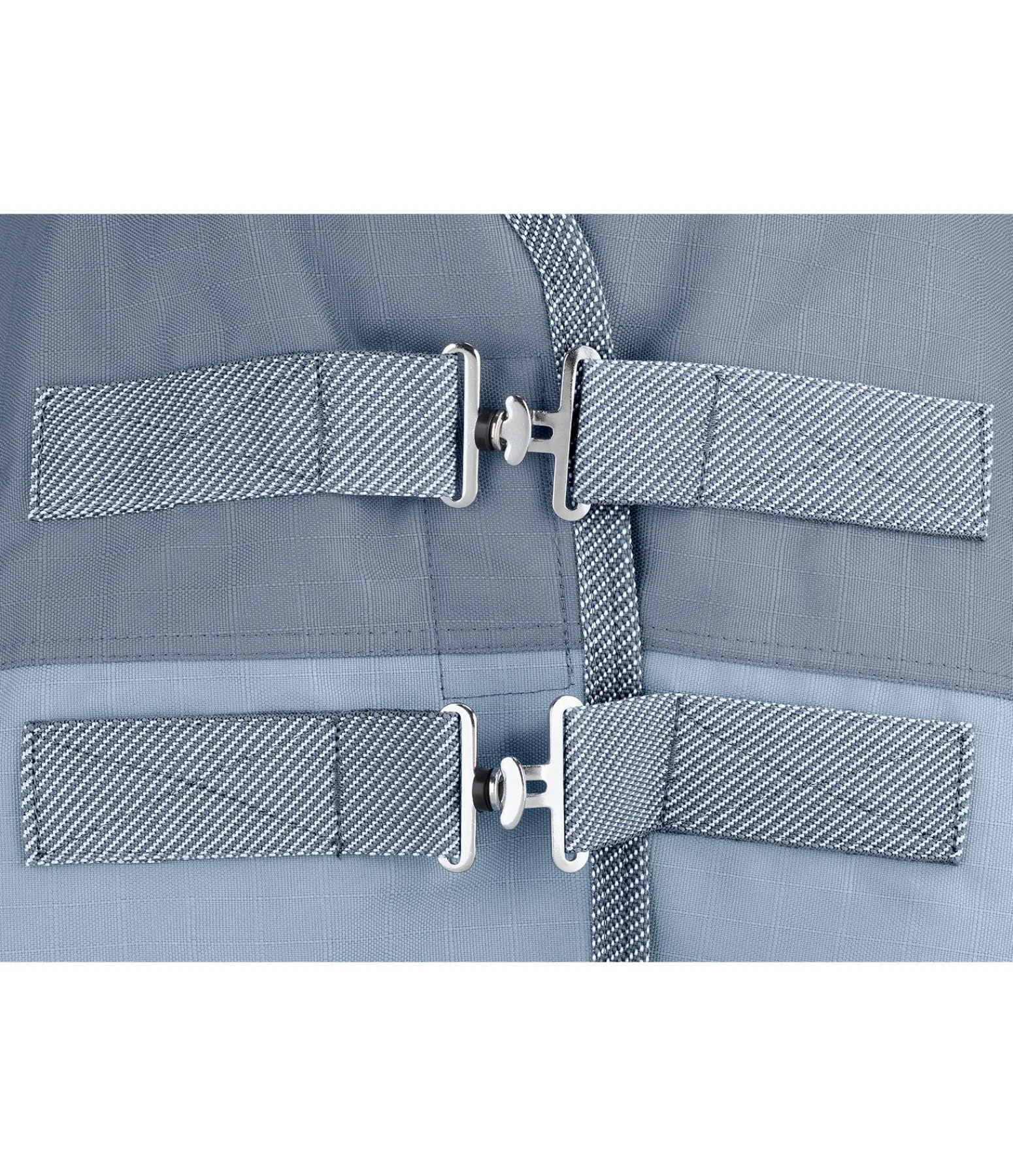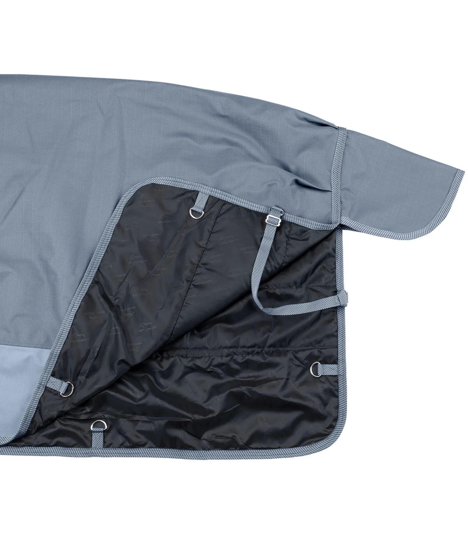 Couverture d’extérieur solide, imperméable (4 000 mm) en matière technique résistante Ripstop 1 000 deniers avec grammage 150 g et coupe Highneck permettant une meilleure répartition des pressions et protégeant le garrot. Grands plis d’aisance pour une liberté de mouvement optimale. Bandes de couleur assortie le long des flancs. Doublure lisse protégeant la robe. Double fermeture de poitrail avec crochets en T, sursangles croisées et courroie de queue réglable. Anneaux permettant de fixer des courroies de cuisses (non incluses). 100 % polyester.