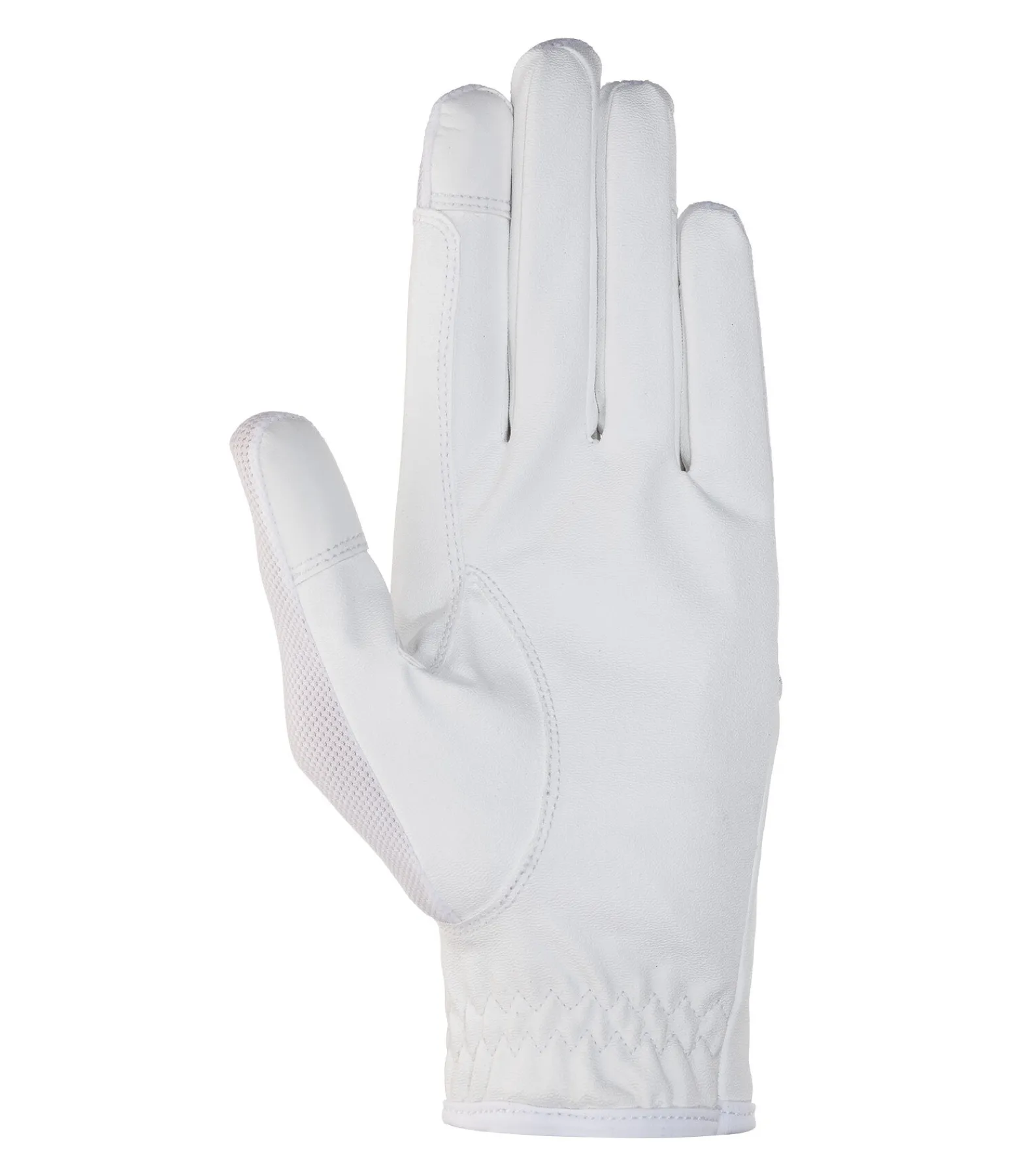 Gants d’équitation d’été élégants et respirants avec dos de la main en matière mesh sublimé de lignes scintillantes. Enfilage facile car sans fermeture. Renfort à l’index. Compatibles avec les écrans tactiles. Dos et paume de main 40 % polyuréthane, 60 % polyester, mesh 100 % nylon.