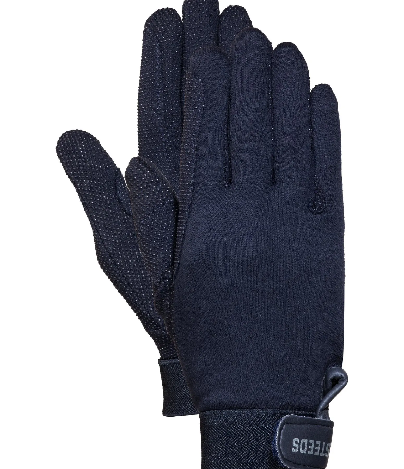 Parfaits gants d’équitation en coton 100 % respirant. Paumes et doigts avec picots PVC. Renforts de rênes. Poignets élastiqués avec patte auto-agrippante. 100 % coton.