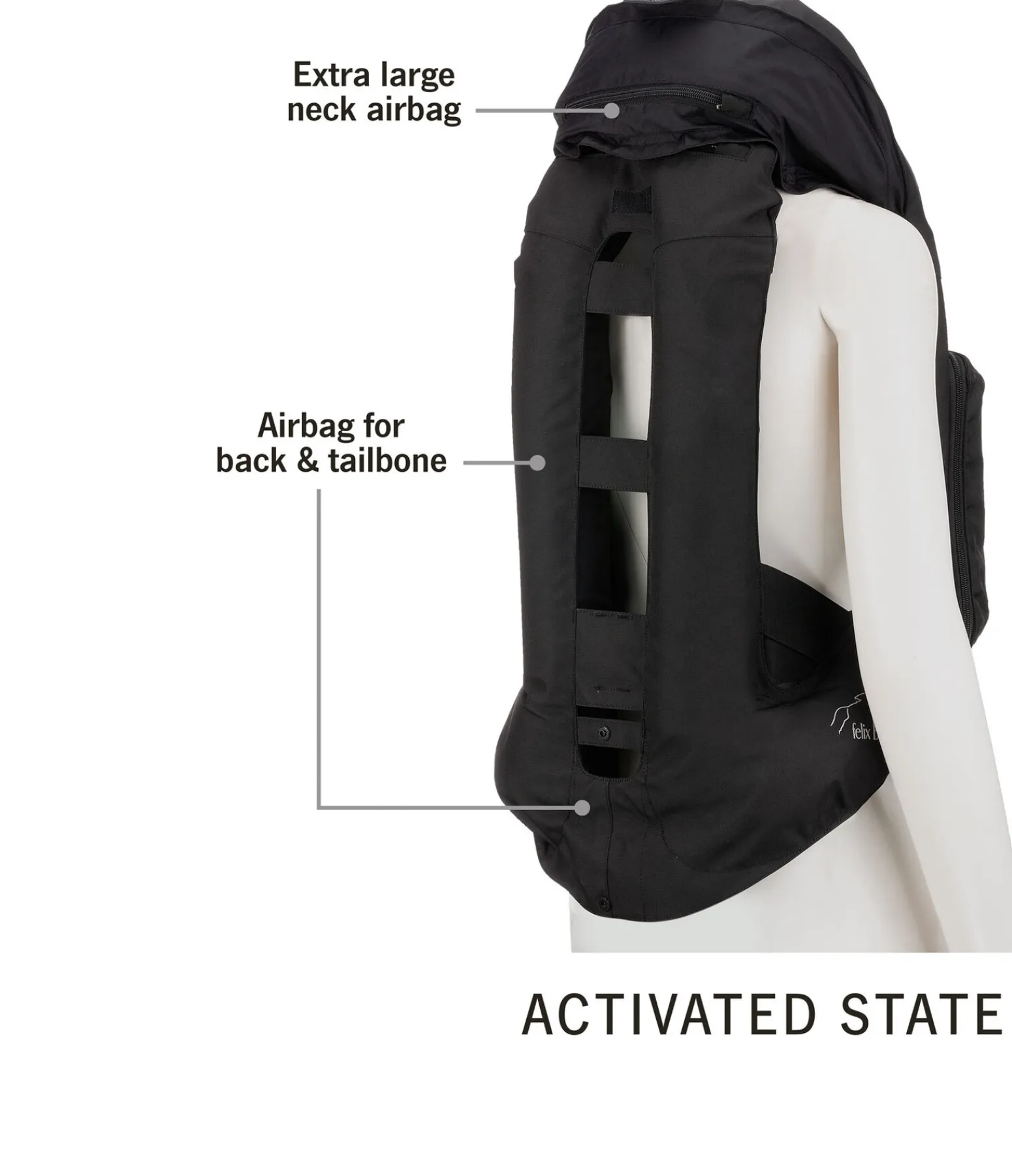 Le gilet est certifié selon la norme pour gilet airbag NF S72-800:2022. À l’avant, des mousses amortissantes sont ajoutées afin de renforcer la protection. Le gilet airbag Felix Bühler se distingue d’autres gilets similaires par son grand airbag au col qui peut réduire ou éviter les blessures au niveau du cou ou de la nuque ainsi que l’hyperextension du cou (coup du lapin). ATTENTION : aucun gilet de protection ou gilet airbag ne peut éviter totalement les blessures. Le gilet airbag ne doit être utilisé que dans le cadre de l’équitation. Pour une protection maximale, il est recommandé de porter une protection dorsale ou un gilet de protection sous le gilet airbag.