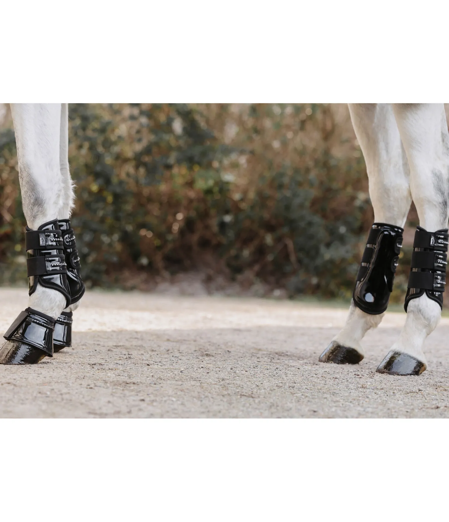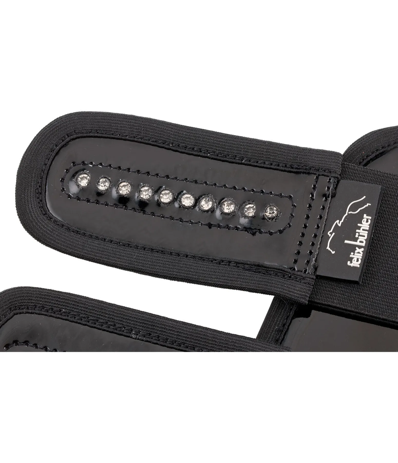 Guêtres anatomiques et élégantes en matière synthétique à l’aspect verni. Avec strass. Doublure intérieure en caoutchouc chloroprène souple pour une protection optimale contre les chocs. Vendues par paire.